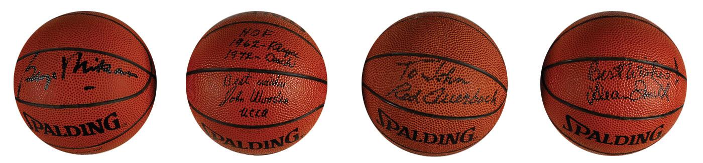 Four official Spalding mini-basketballs each signed in black felt tip. Signers are: Red Auerback (ins), George Mikan, Dean Smith (adding “Best Wishes”), and John Wooden (signed ”HOF 1962–Player, 1972–Coach, Best wishes, John Wooden, UCLA”). In very fine condition.