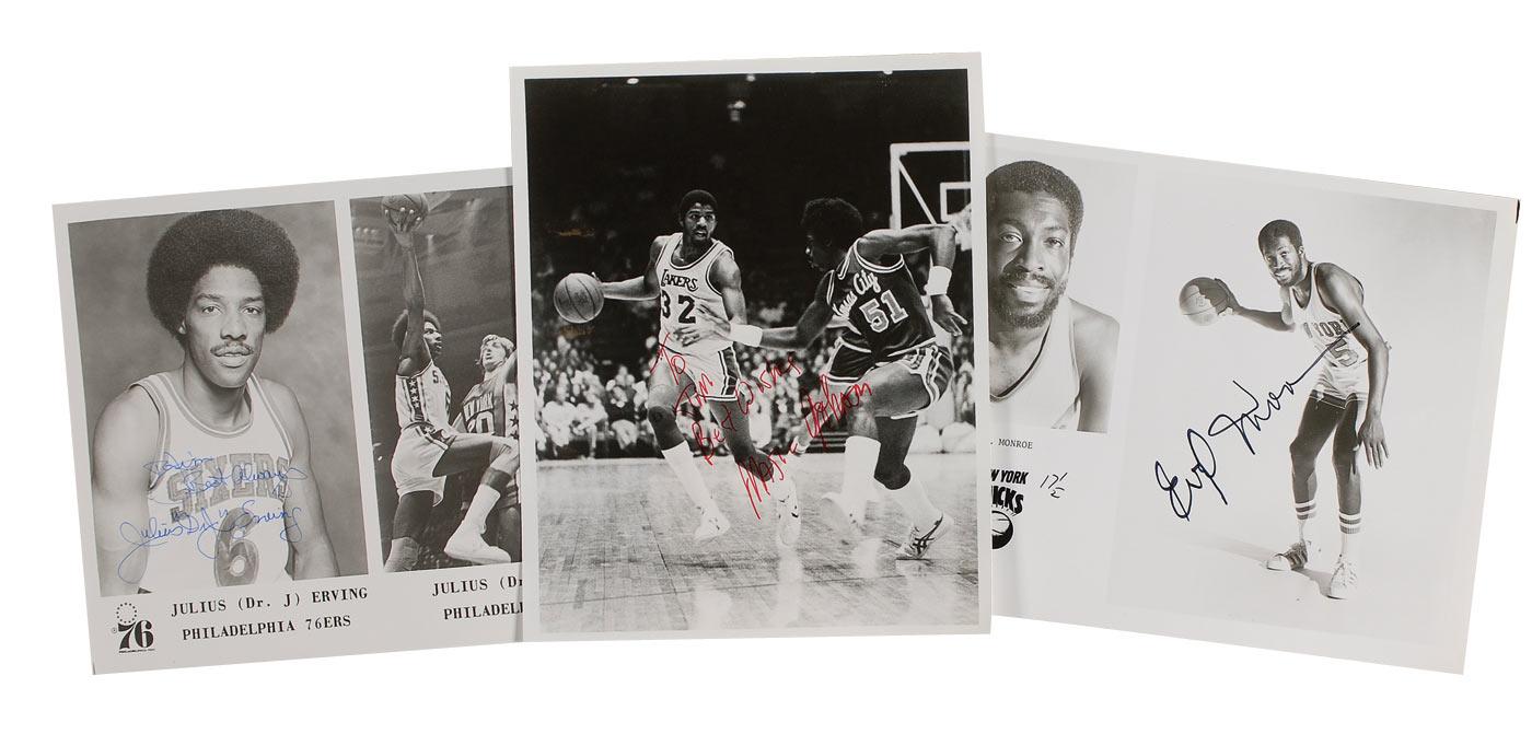 Three glossy photos, all 8 x 10 or 10 x 8, each signed in ink or felt tip by the respective player pictured. Signers are: Earl Monroe, Julius Erving (ins), and Magic Johnson (ins). In overall fine condition.