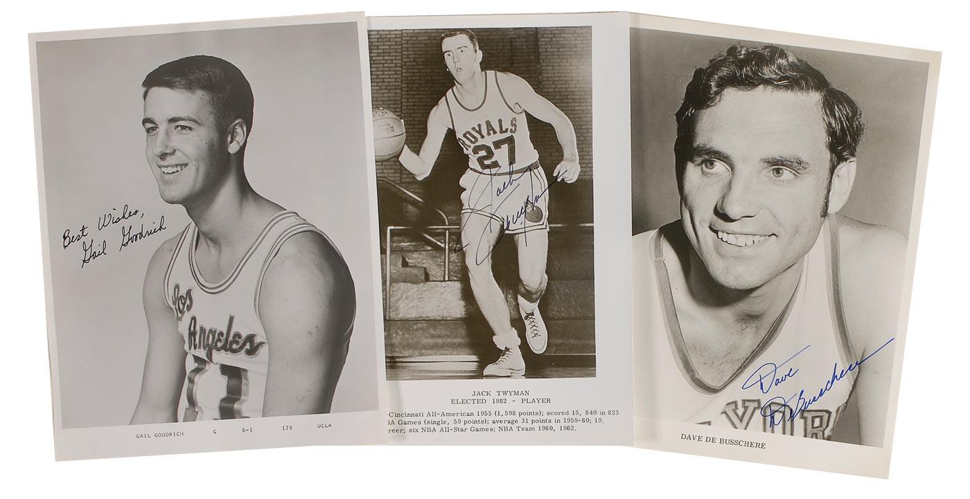 Three glossy photos, all 8 x 10, each signed in felt tip by the respective player pictured. Signers are: Dave DeBusschere, Gail Goodrich, and Jack Twyman. In overall fine condition with some handling wear and edge dings to the DeBusschere photo.