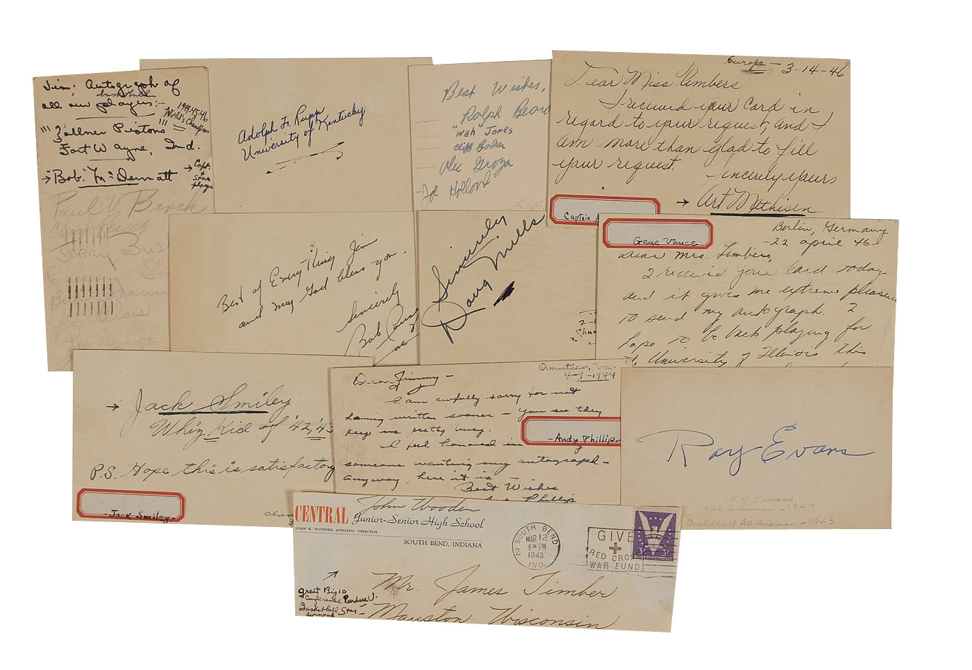 Ten items consisting of signatures on various size slips, cards, sheets, and government postcards, each signed by a former basketball great. Signers include: John Wooden, Adolph Rupp, Bob Cousy, Bob McDermott, Ray Evans, Andy Phillips, Jack Smiley, Gene Vance, Art Mathisen, and Doug Mills. In very good condition, with various scattered toning, folds, and mounting remnants to many of the corners.
