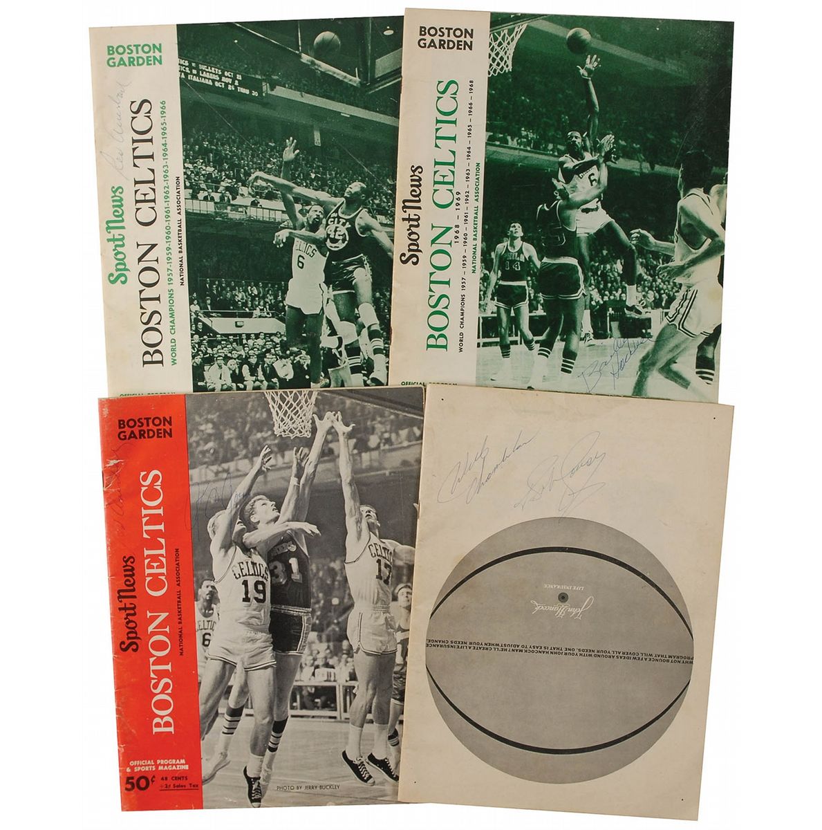 Four 1960s Boston Celtics programs, each approximately 8.5 x 11, signed in blue ballpoint: one 1965 playoff program signed on the reverse by Wilt Chamberlain and Bob Cousy; one 1968 program signed on the front cover by Red Auerbach and K. C. Jones; one 1966 game program signed vertically on the front cover by Red Auerbach; and one 1969 playoff program signed on the front cover by Bailey Howell. In very good condition, with scattered creasing and soiling, some light areas of damp staining, part of one of the Auerbach signatures partially faded, and areas of surface loss to the covers.