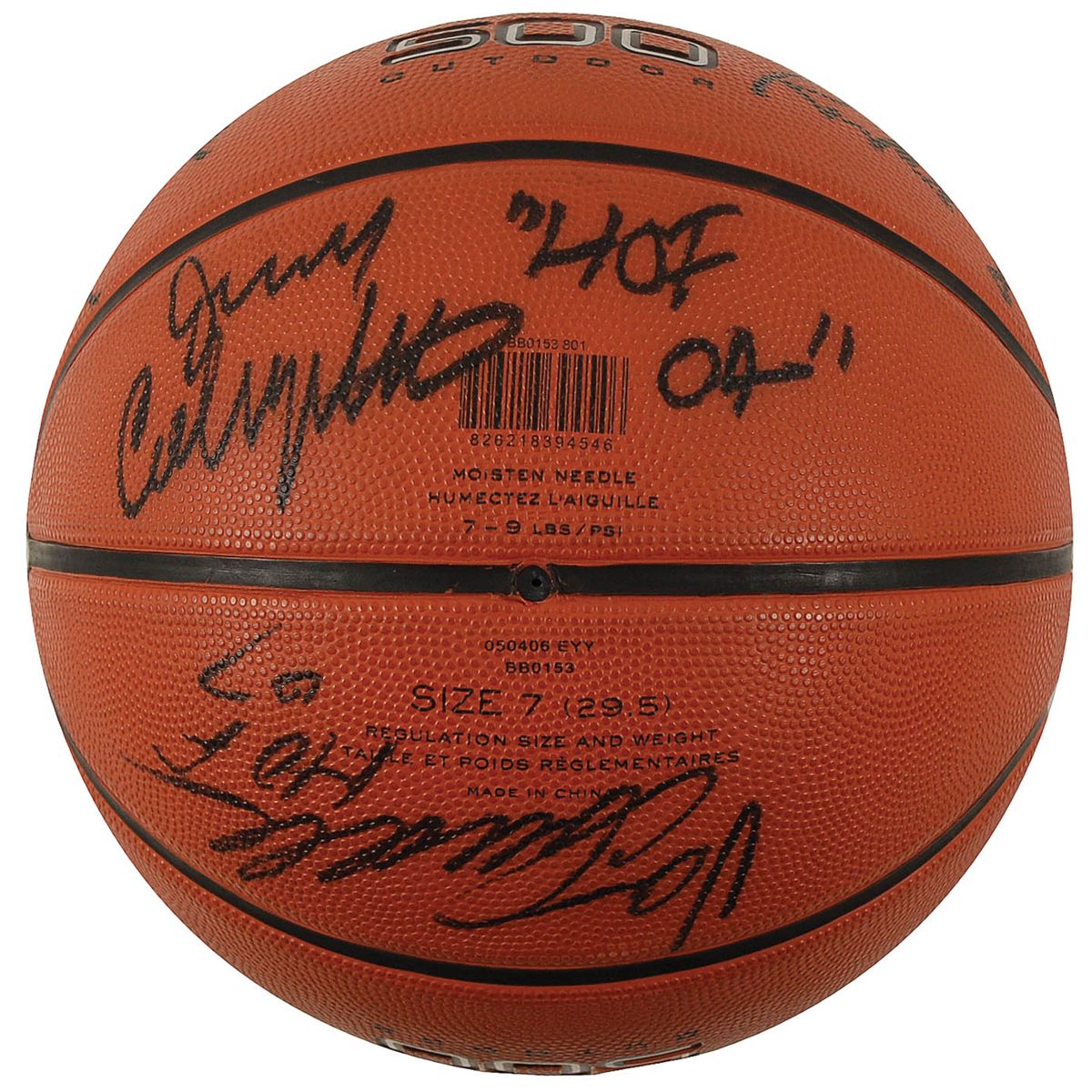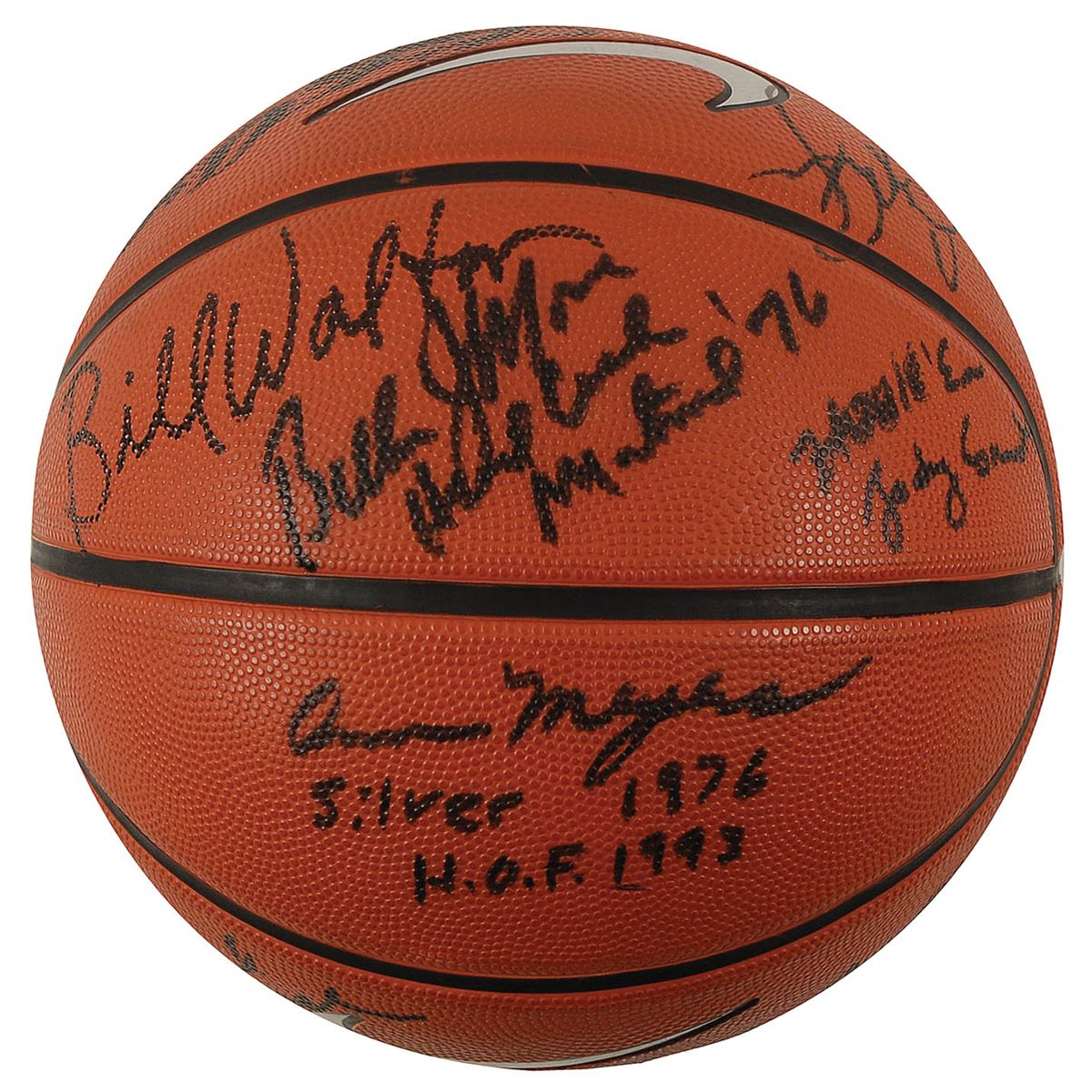 Official Nike 500 outdoor basketball signed in black felt tip on the side panels by a number of successful basketball players and coaches. Signers are: Rick Barry, Bill Walton, Jerry Colangelo, Van Chancellor, Lute Olson, Jody Conradt, Cynthia Cooper, Mirko Novosel, Ann Meyers, Walter Bellamy, and Carol Blazejowski. In fine condition.
