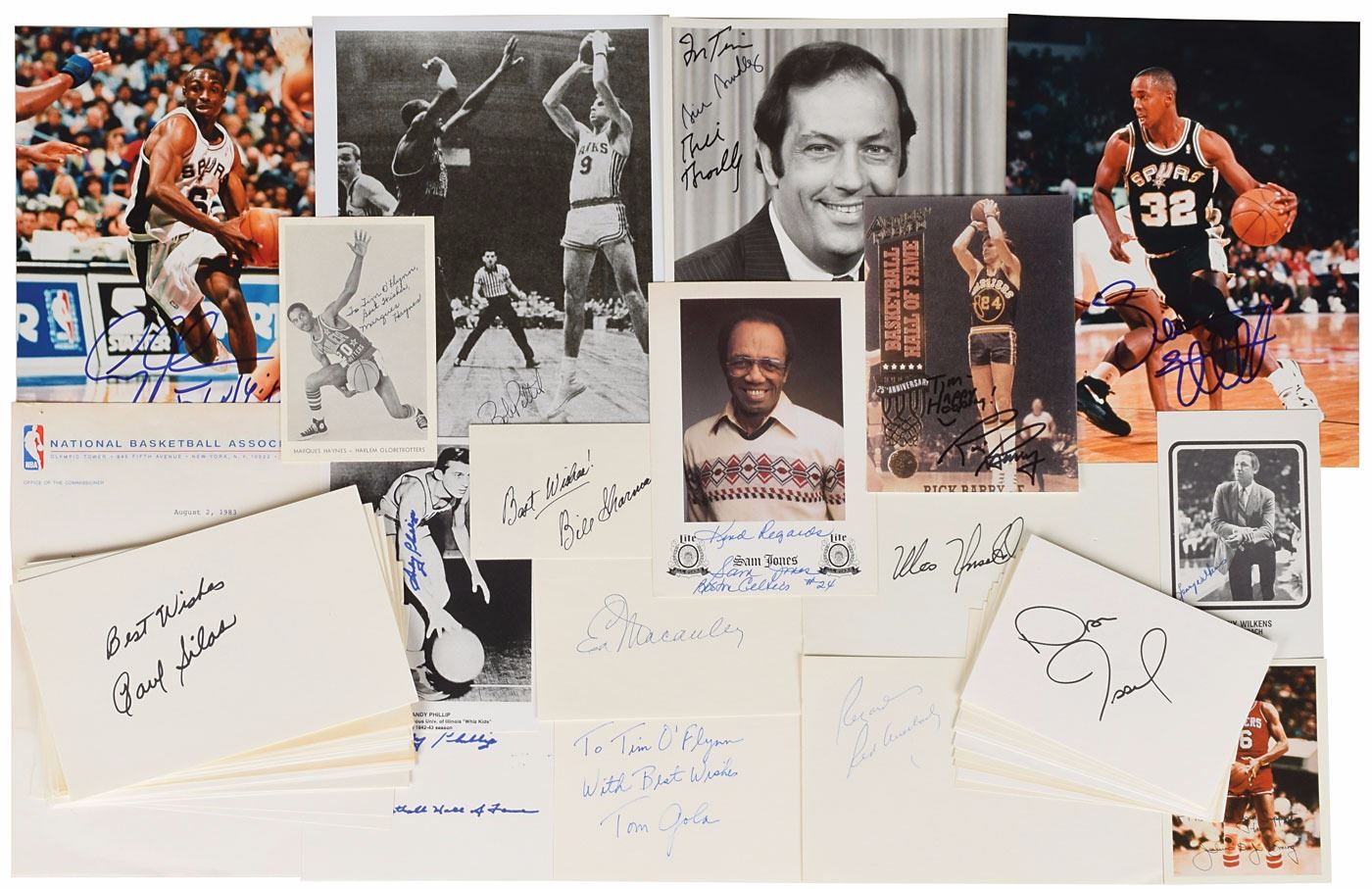 Collection of 53 items signed by various basketball legends, consisting mostly of signatures on off-white 8 x 5 cards, with some inscribed. Players and coaches include: Danny Ainge, Paul Arizin, Al Attles (2), Red Auerbach, Rick Barry (2), Elgin Baylor, Bill Bradley, Wilt Chamberlain, Bob Cousy, Dave Cowens, Chuck Daly, Dave DeBusschere, Sean Elliott, Julius Erving, Tom Gola, Hal Greer, Cliff Hagan, Alex Hannum, Marques Haynes (2), Tom Heinsohn, Dan Issel, Avery Johnson, K. C. Jones, Sam Jones (2), Clyde Lovellette, Ed Macauley, Slater Martin, Bob McAdoo, Vern Mikkelsen, Don Nelson, Larry O’Brien, Bob Pettit, Andy Phillip (2), Greg Popovich, Jack Ramsay, Willis Reed, Pat Riley, Oscar Robertson, Byron Scott, Bill Sharman, Paul Silas, Wes Unseld, Jerry West, Paul Westphal (2), Lenny Wilkens (2), and Jay Wright. In overall fine condition.