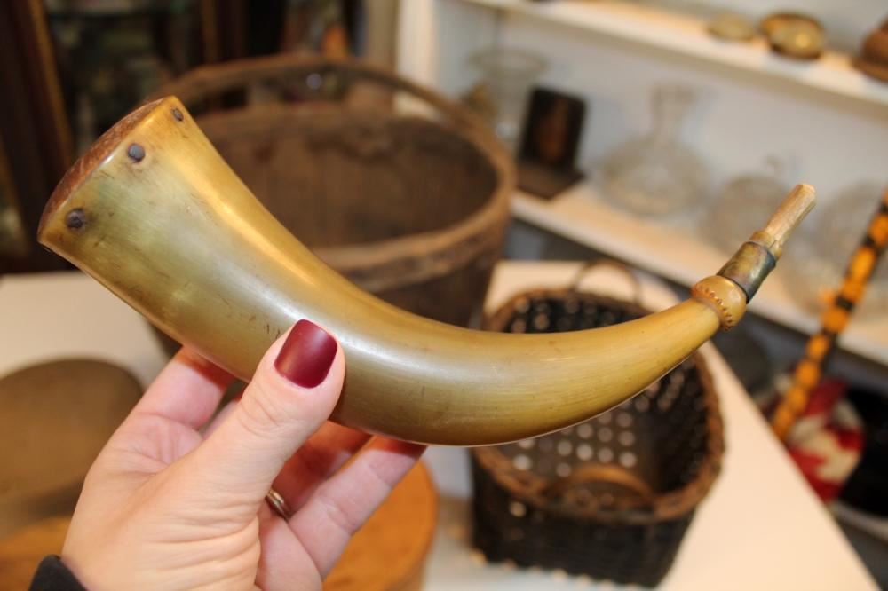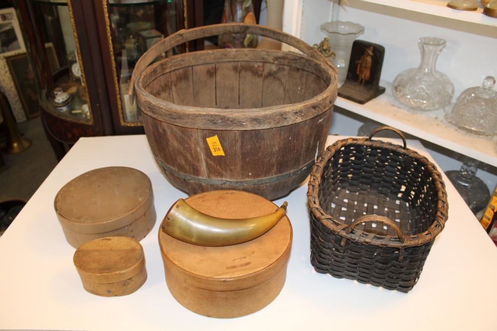 Hand woven apple basket with wooden handle, hand woven berry basket, firkins and Shaker box, and powder horned signed AL. Apple basket measures approx. 15 inches wide x 9.5 inches tall