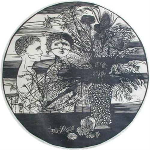 Children and Stillife is an original woodcut by Leonard Baskin (American 1922-2000). This work of art is signed, titled and numbered artist proof in pencil. The paper is thin, similar to onion skin paper. The woodcut is 12 x 12 inches, the paper is 17 x 15 inches and has been taped to a white mat that is 22 x 16 inches. The art is in very good condition with just some very minor tan spots in the margin. A highly respected draftsman, printmaker, teacher, and sculptor, Leonard Baskin had the ability to depict in an abstract style man and his relation to the world. Whether working with bronze or wood or two-dimensional mediums, his focus remained on large heroic, but flawed human beings who at times recall photographic images of concentration-camp victims or birds with human bodies that suggest mythological forms.