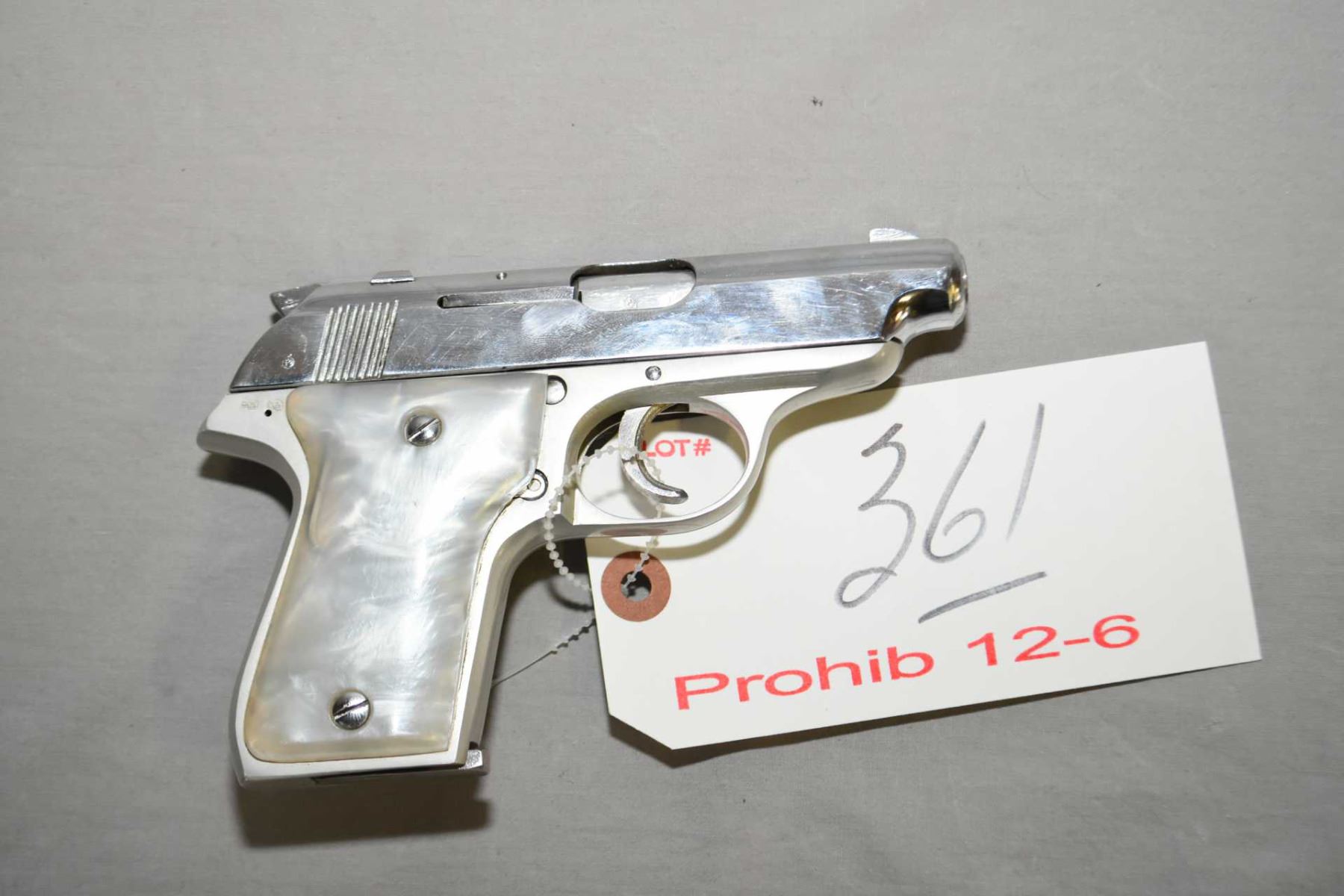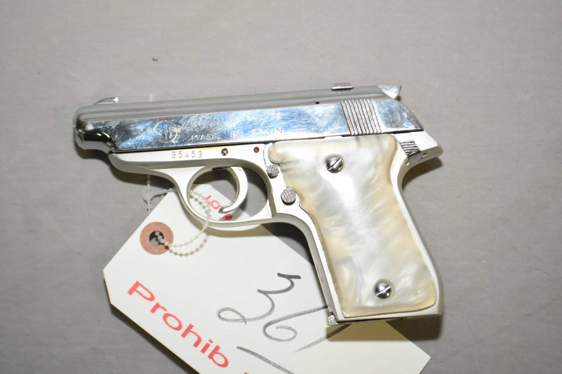 Basque ( Echave Arizmendi Cia ) Model Basque .32 Auto Cal 7 Shot Semi Auto Pistol w/ 79 mm bbl [ two tone nickel and satin finished receiver, plastic pearl like grips, fixed sights, few slight marks ] Ser # 95453 Prohib 12 - 6 Cert # 15664224 FRT # 18731 - 12