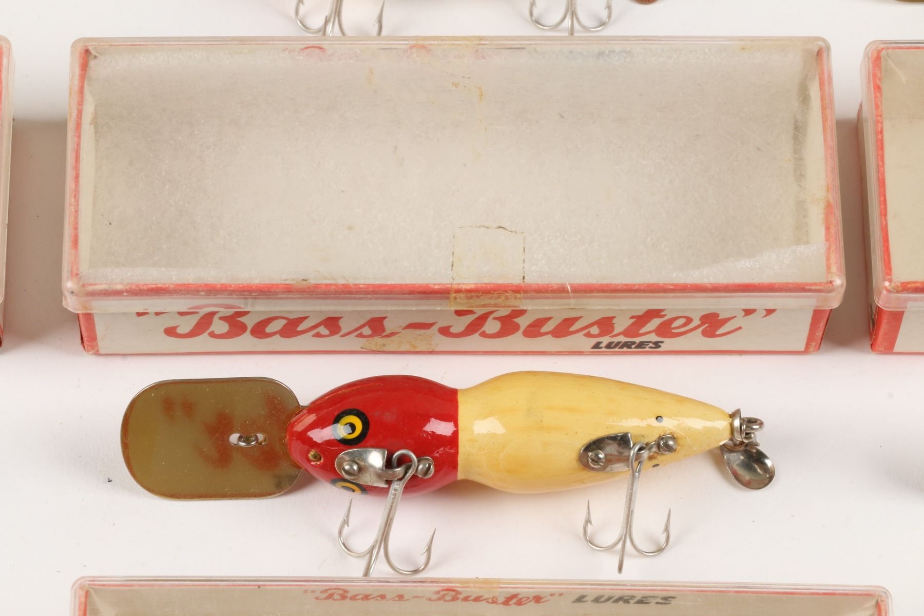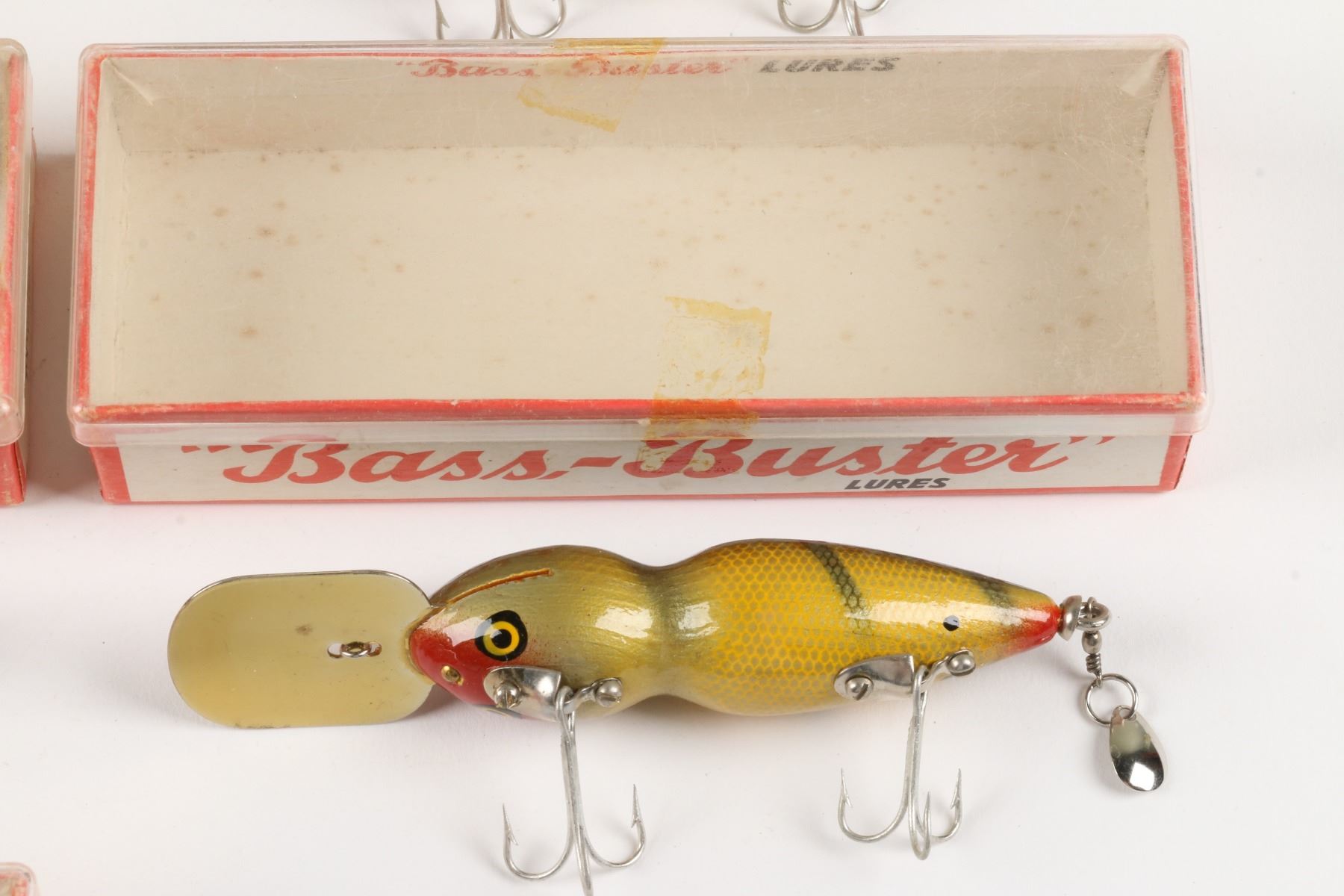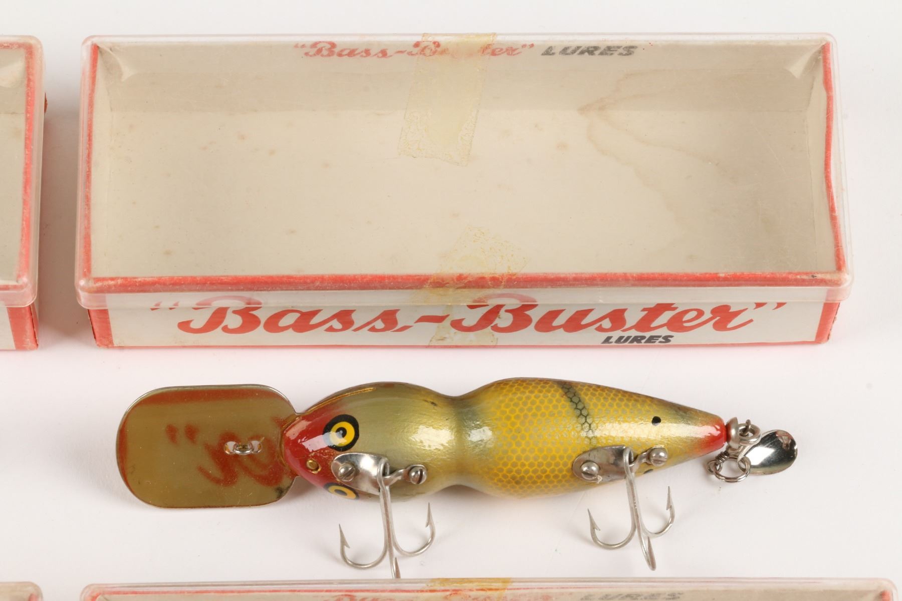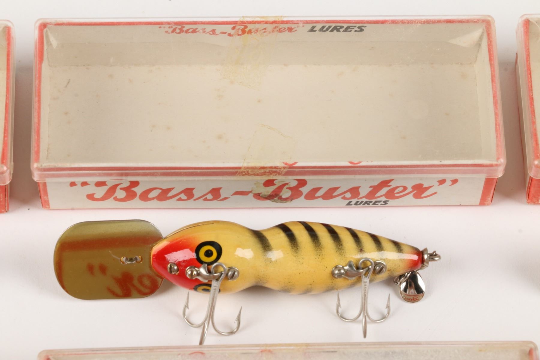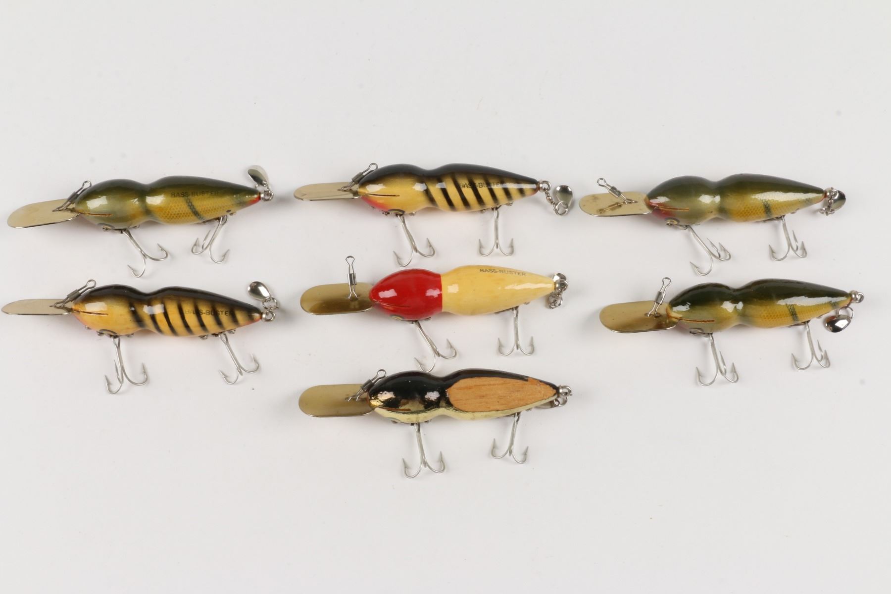 Bass-Buster Lures, United States. Boxed. Material: Wood. Quantity: 7. Grade: VG+. 5" boxes. Est. $75-100.