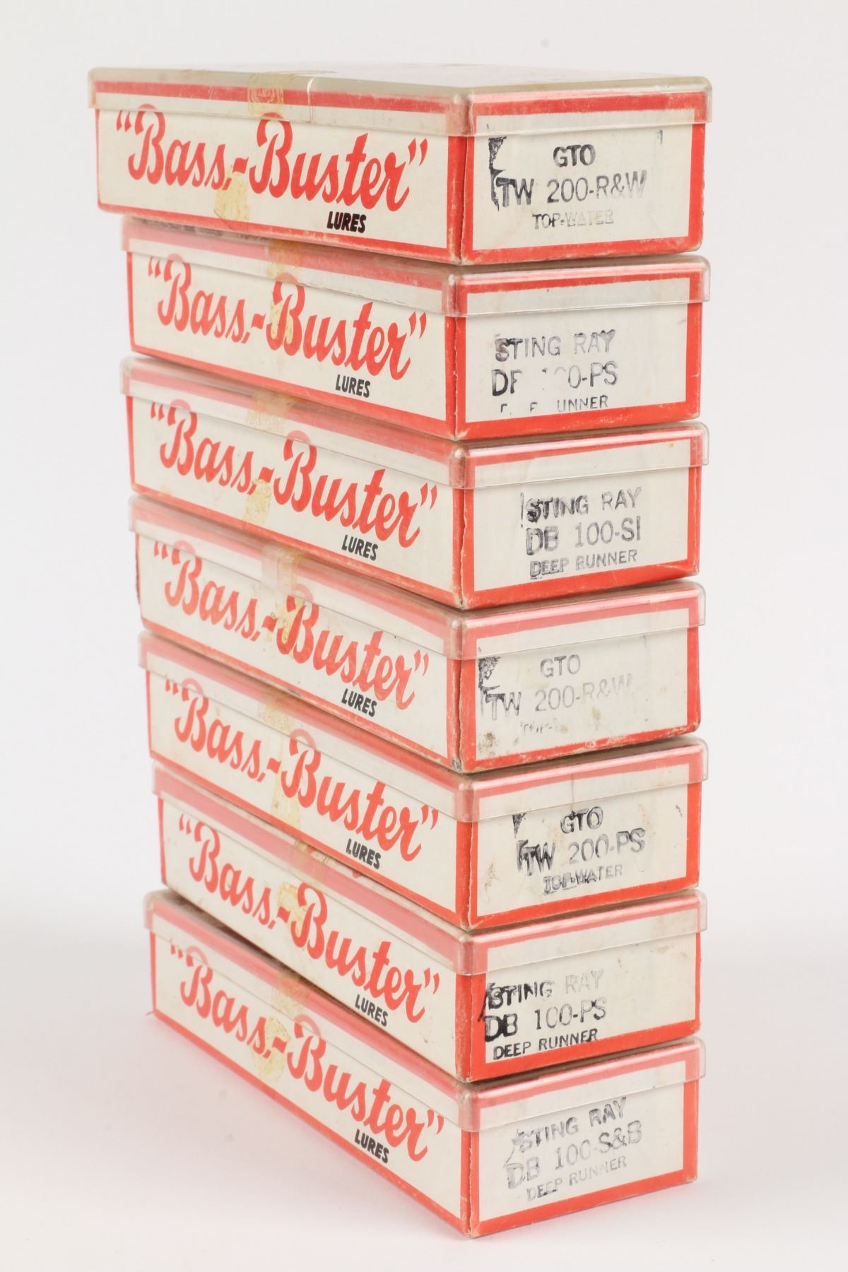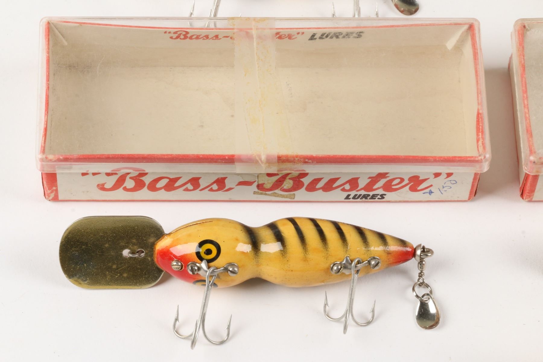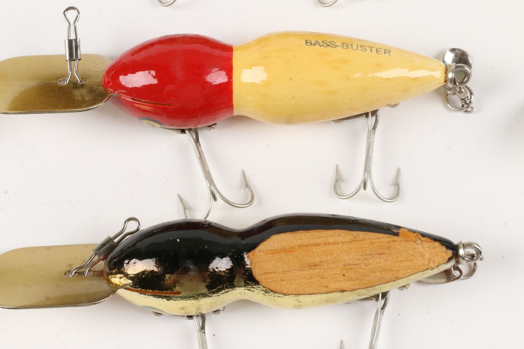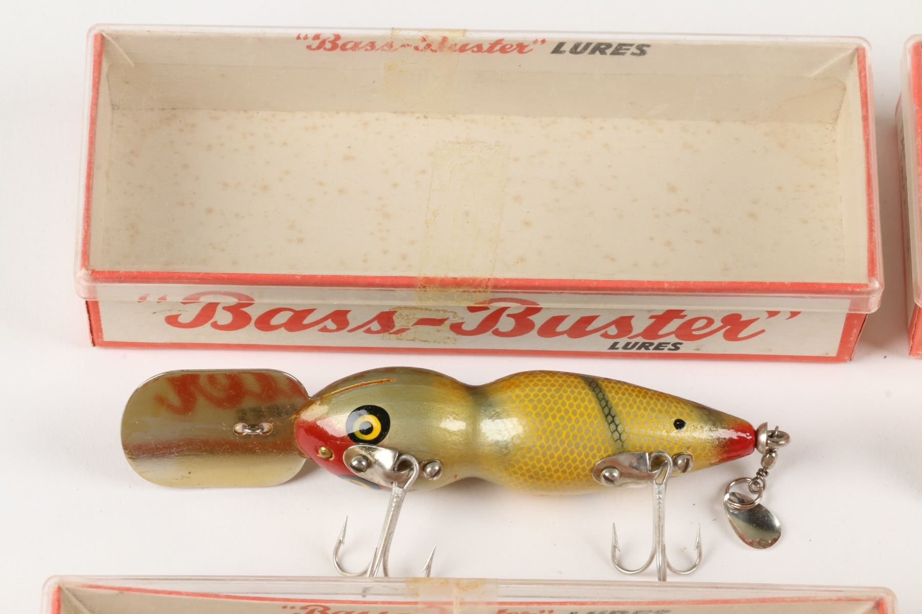 Bass-Buster Lures, United States. Boxed. Material: Wood. Quantity: 7. Grade: VG+. 5" boxes. Est. $75-100.