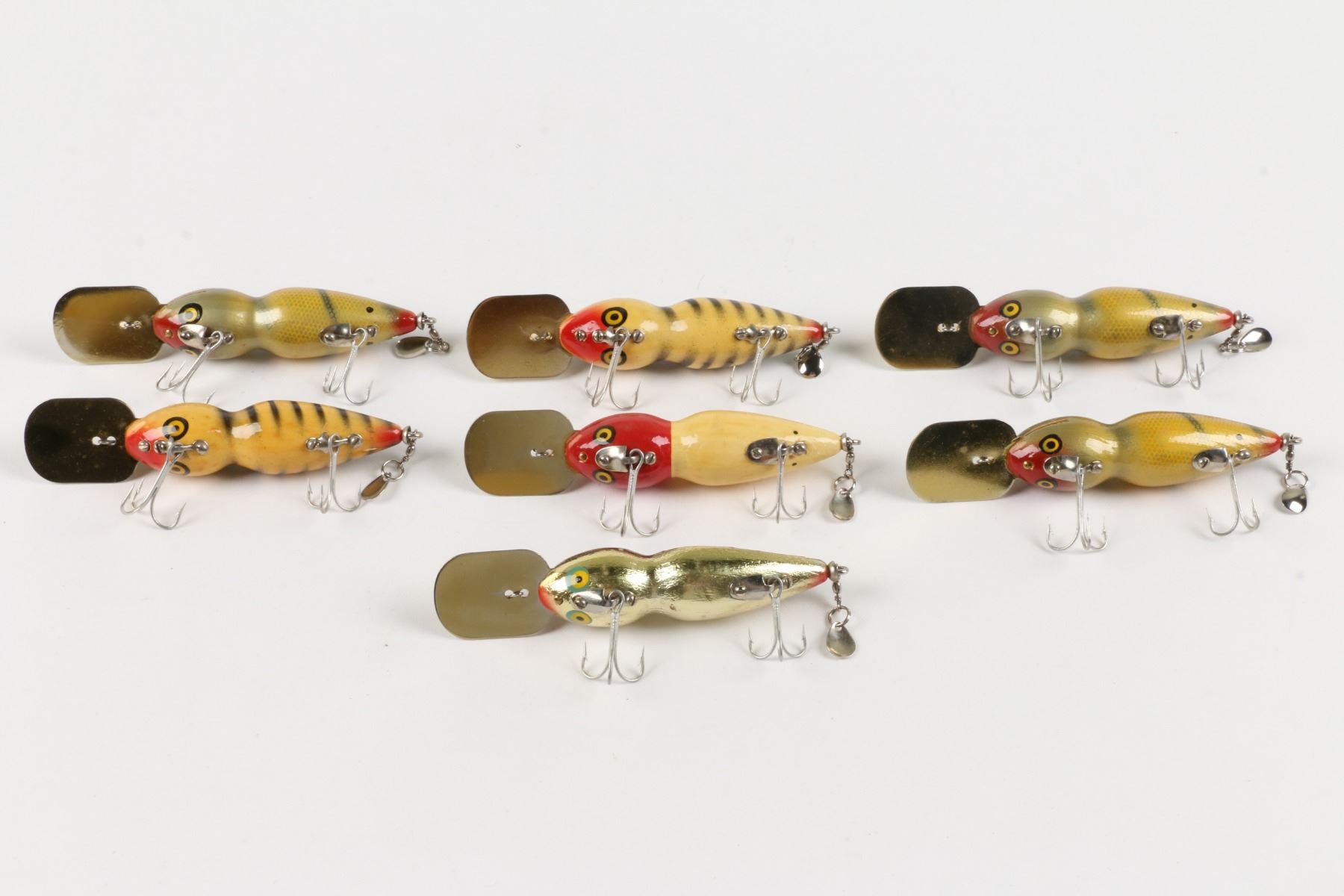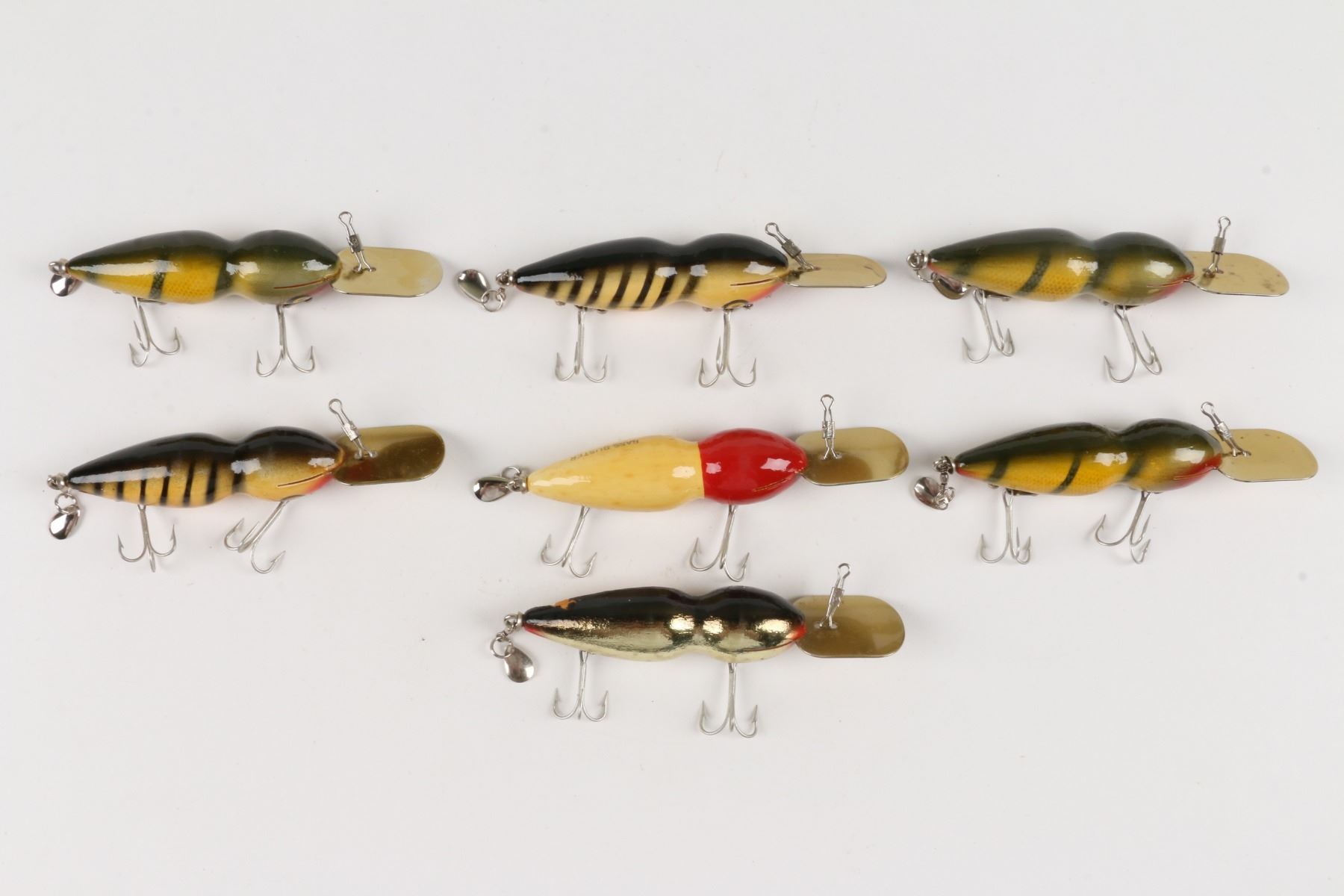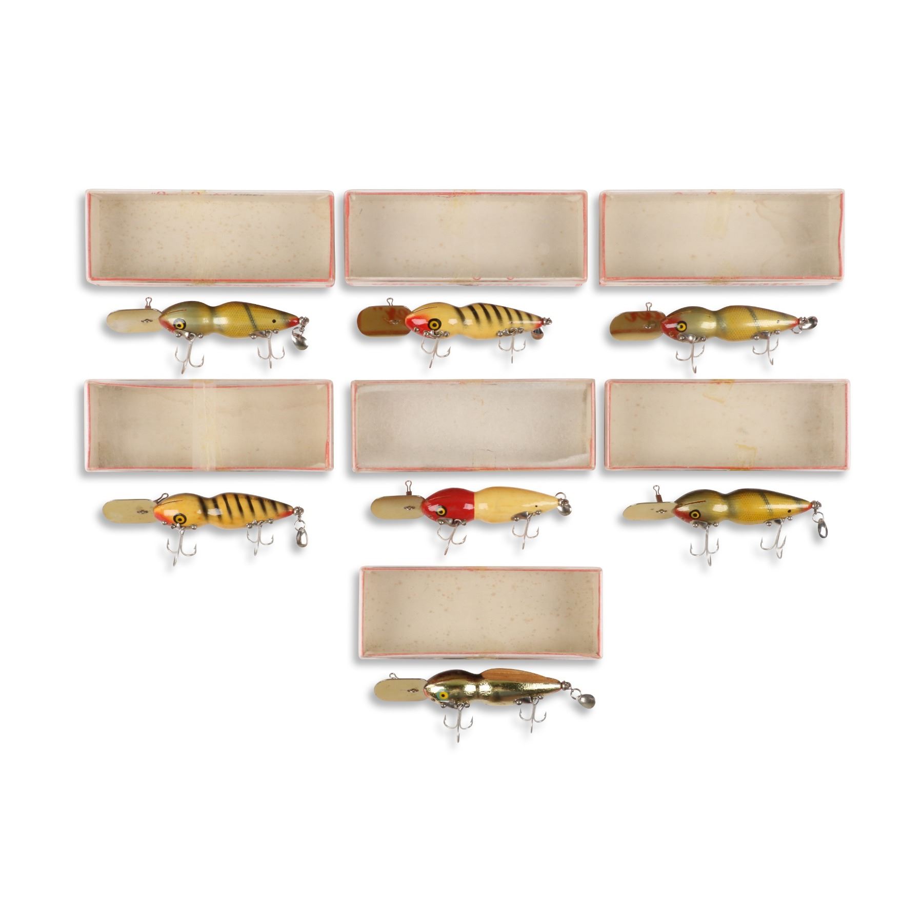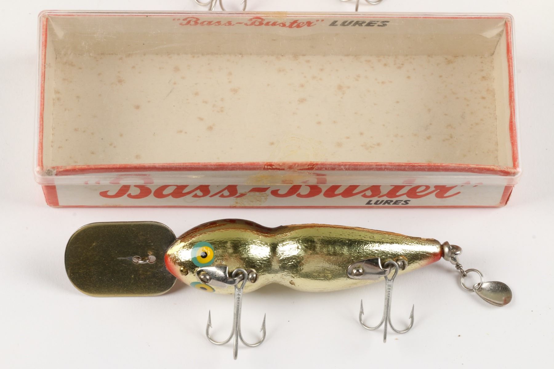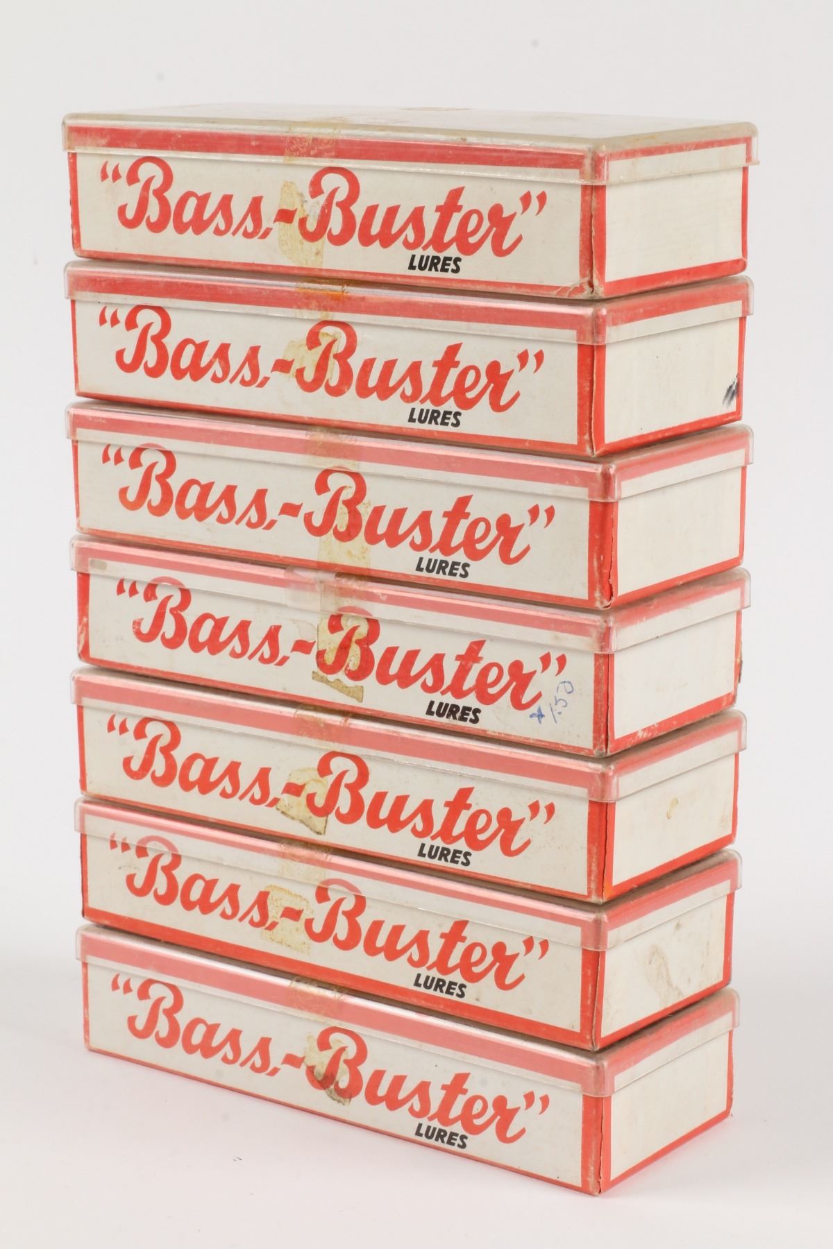 Bass-Buster Lures, United States. Boxed. Material: Wood. Quantity: 7. Grade: VG+. 5" boxes. Est. $75-100.