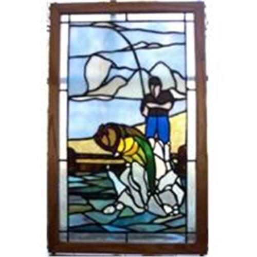 Stained Glass Window Panel of Fisherman and Bass going for the bait. Great for the man in your life that enjoys fishing.</em></td>
