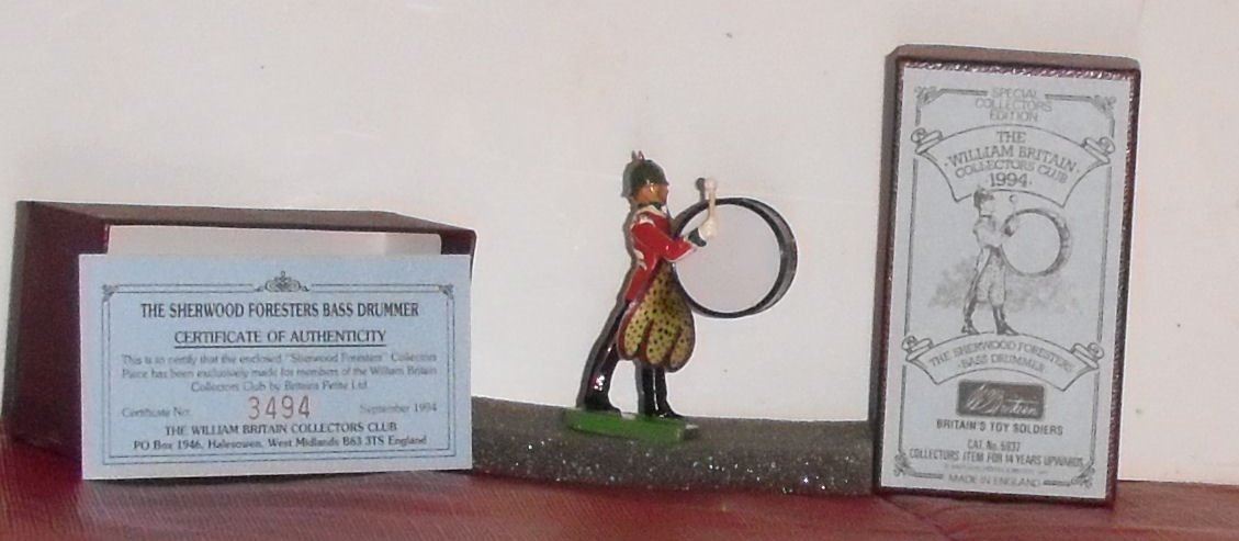 Bass drummer, limited edition, with certificate and box, 1994 Special Collectors Edition for the William Britain Collectors Club Toy Soldiers; this "Bass Drummer" is part of the Sherwood Foresters collection and catalogue no. 5937; great as Made in England, for collectors rare items ; measures about 3 inches high; rare and hard to find and a wonderful addition for your collection, as in, in mint condition, for your toy collection now.