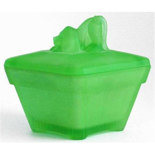 Known as Basset Hound the finial on the lid of this diamond shaped powder jar features a playful Basset Hound puppy. Shown on pg 17 of Whitmyer - Bedroom & Bathroom Glassware of the Depression Years. The tapered Art Deco base is footed. Produced in glowing green satin glass and measuring about 4 1/4" tall x 5 1/2" long. With the exception of minor roughness and a couple of small chips under the rim of the lid, both the jar and lid are in excellent condition