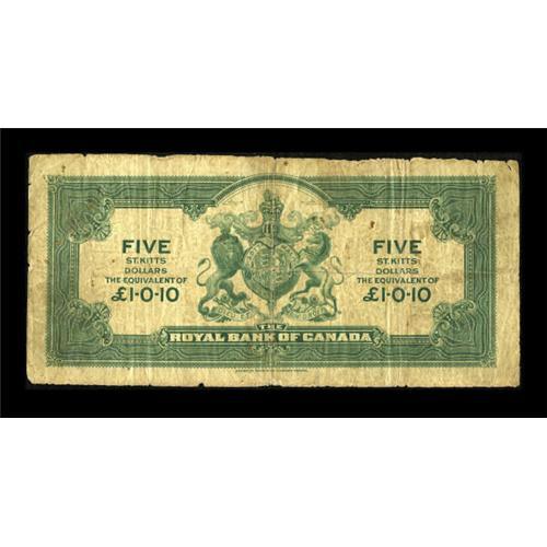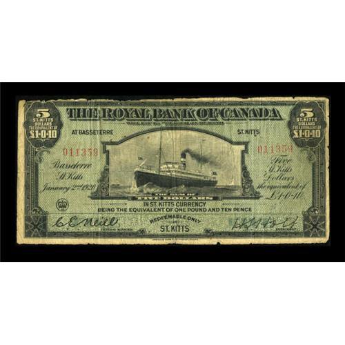 <B>Basseterre, St. Kitts- The Royal Bank of Canada</B></I> $5 Jan. 2, 1920 Ch. # 630-58-02<BR> This note is one of the great rarities of the Flynn holdings, and may well be the sole extant signed and issued example of this issue known. This piece is priced only in Very Good in the Charlton catalogue, and the illustration there is of a cancelled Specimen. This piece is well circulated, and displays a bit of margin roughness, as well as a handful of pinholes, but where can another be obtained at any price? <B>Very Good.</B></I><BR><I>From The Thomas M. Flynn Collection</B></I><BR><BR><b>Shipping:</b> Coins & Currency (<a target="_blank" href="http://www.heritageauctions.com/common/shipping.php">view shipping information</a>)