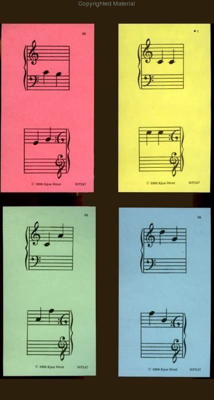 These flashcards teach melodic intervals from a 2nd through the octave and are color coded for C major 5-finger position, 6ths, 7ths, and octaves. The cards use the same size staff and notes students are accustomed to seeing on a grand staff.
