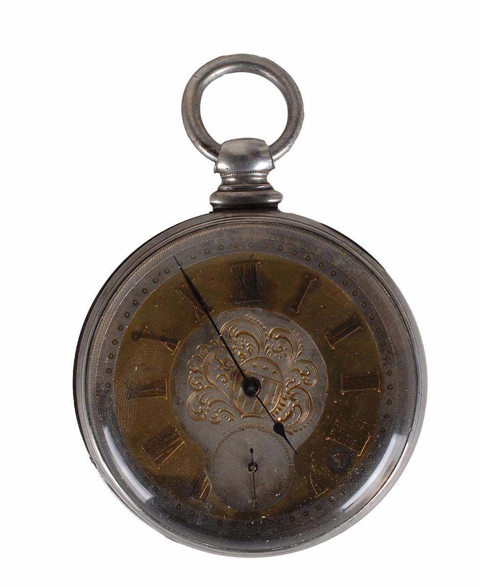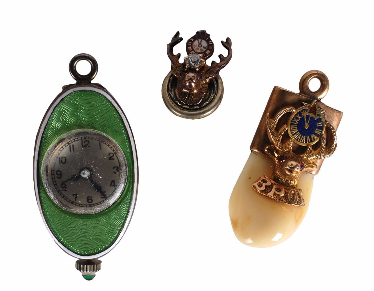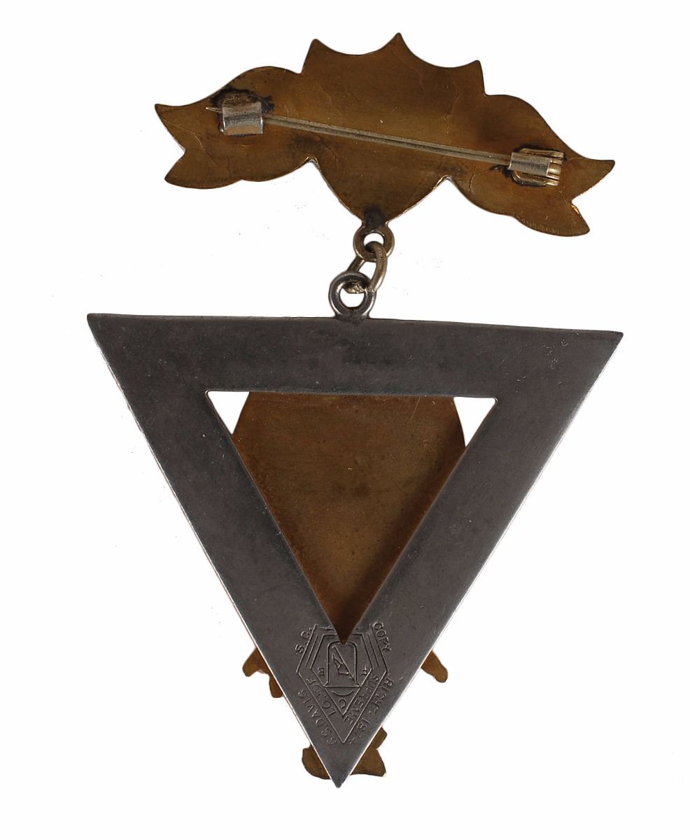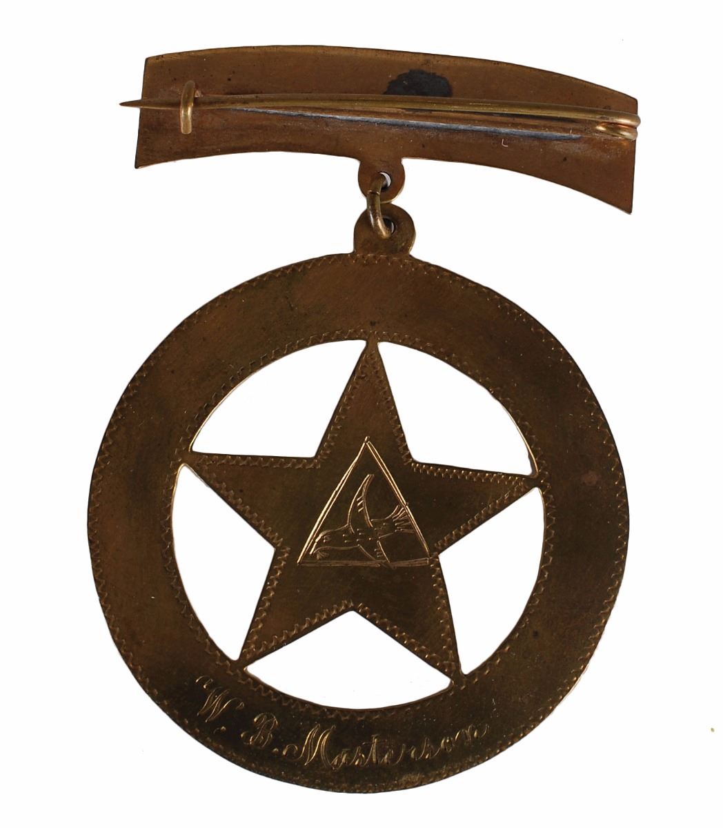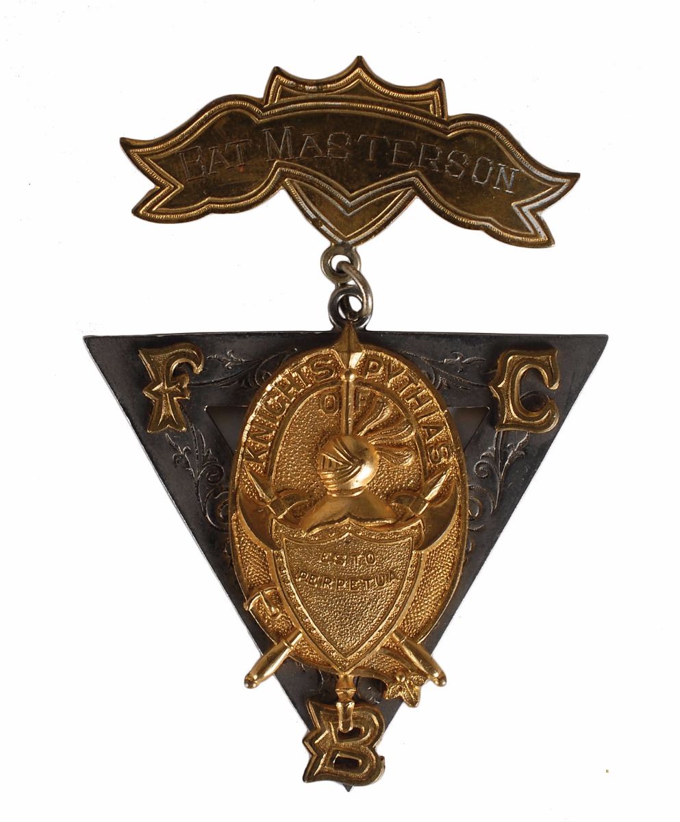 Two different fraternal lodge badges personally owned by Bat Masterson, including one for the Knights of Pythias and one for the Rebekah Order of the Odd Fellows. The first features a triangular badge bearing the Knights of Pythias symbol suspended from a pin inscribed with his name, “Bat Masterson,” and bears a manufacturer’s stamp on the reverse with an 1874 copyright date. The second is designed as a star within a circle and features masonic imagery, engraved on the front of the pin, “D. G. L. No. 5,” with his name engraved at the bottom of the reverse, “W. B. Masterson.” Includes two small Elks pins, a pocket watch, and a green watch charm that were with the collection when purchased at the estate sale of Charlie E. Stup in December 1985. Accompanied by a packet of extensive research material regarding these items.
