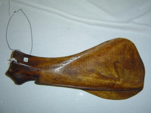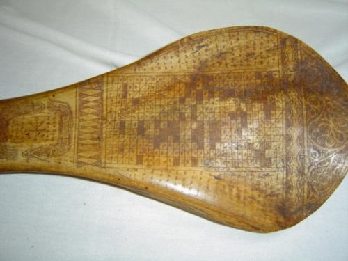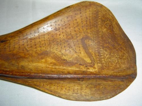 From the Batak people of Northern Sumatra, Indonesia come artifacts rich in ancient lore. This 12.75" X 5.75" Scapula Bone Amulet is ornately etched with the Ritual Batak Lunar Calendar, Batak Compass and both a carving and etching of a lizard depicting the God Boraspati. The identification of auspicious and inauspicious days is/was one of the Datu's, (magician-priest), pricipal task. Before every festival, journey, planting or havest, building of a home or village, it is necessary to decide whether the planned time of the project is advantageous. To do this, a magician-priest uses his extensive knowledge of the calendar, the stars and the position of the astralogical god of the underworld, (represented by the serpent etching of the compass). These amulets are used for fortune telling and for forcasting horoscopes for individuals as well as for the entire village. This Batak Scapula Amulet is animal origin and is in excellant condition.