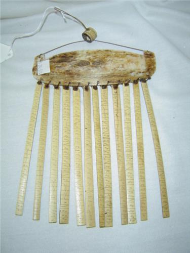 From the Batak people of Northern Sumatra, Indonesia come calenders rich in ancient lore. The Batak are one of the few cannibalistic peoples known to have a written language. During the 12th and 13th centuries traders arriving from the Asia subcontinent converted the Batak to Islam. Rather than abondoning their belief systems, they were integrated into their new faith. This bone and bamboo calendar is one manifestation of this phenomenon. Overall size is approx. 10"H X 6.25"w. The Year of the Bataks is like ours, also divided into twelve lunar months, each consisting of thirty days. The twelve bamboo sticks correspond to the months and each stick is hand inscribed with thirty segments representing thirty days. This grill serves as support for among other things a number of particular signs and tokens for persons using it. The bonepiece at the top is decorated with a scorpion.