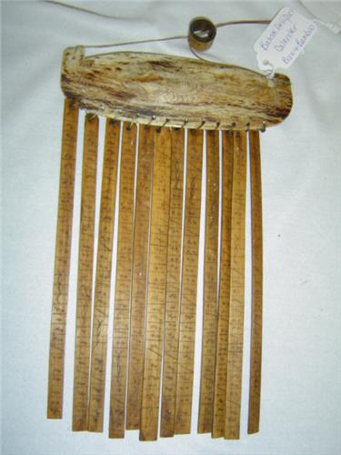 From the Batak people of Northern Sumatra, Indonesia come calenders rich in ancient lore. The Batak are one of the few cannibalistic peoples known to have a written language. During the 12th and 13th centuries traders arriving from the Asia subcontinent converted the Batak to Islam. Rather than abondoning their belief systems, they were integrated into their new faith. This bone and bamboo calendar is one manifestation of this phenomenon. Overall size is approx. 11"H X 5.5"w. The Year of the Bataks is like ours, also divided into twelve lunar months, each consisting of thirty days. The twelve bamboo sticks correspond to the months and each stick is hand inscribed with thirty segments representing thirty days. This grill serves as support for among other things a number of particular signs and tokens for persons using it. The bonepiece at the top is decorated with a scorpion.
