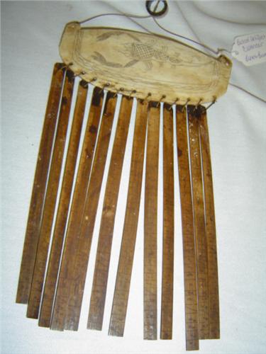 From the Batak people of Northern Sumatra, Indonesia come calenders rich in ancient lore. The Batak are one of the few cannibalistic peoples known to have a written language. During the 12th and 13th centuries traders arriving from the Asia subcontinent converted the Batak to Islam. Rather than abondoning their belief systems, they were integrated into their new faith. This bone and bamboo calendar is one manifestation of this phenomenon. Overall size is approx. 11"H X 5.35"w. The Year of the Bataks is like ours, also divided into twelve lunar months, each consisting of thirty days. The twelve bamboo sticks correspond to the months and each stick is hand inscribed with thirty segments representing thirty days. This grill serves as support for among other things a number of particular signs and tokens for persons using it. The bonepiece at the top is decorated with a scorpion.