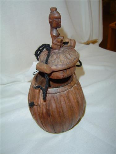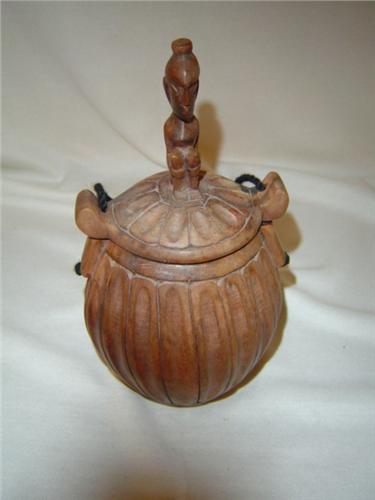 This is a 7.5" reproduction piece of a very old Traditional Batak Medicine Carrier found in a Dutch museum. Hand carved from plantation grown hardwoods, potion carriers are used to store medicinal herbs and potions. The fitted stopper features the traditional squatting figure. Carefully remove the stopper to reveal the inner compartment. This piece is in excellant condition. An occasional application of oil will help maintain the high luster of the wood. The Batak homeland is the island of Sumatra at the western end of the modern Republic of Indonesia. It's the fifth largest island in the world and many other tribes live there. Batak peoples live in the remote areas of the mountainous highlands and the eastern and western coastal regions. One thousand meters above sea level, the highlands steep valleys and thick forests made the Batak region inaccessible and impenetrable during the period of scientific, missionary and colonial development. Long known to Europe, the Batak have only relatively recently come to the attention of the West. The Batak consist of six ethenic groups, diverse in dialect and historical experience. Although Islam and Christianity have been strong influences, many of the Batak population still follow religious ideas and practices of their ancestors. The Batak are one of the few cannibalistic peoples know to have a sophistacated calendar, written language, and with their gold trade, also a system of numbers. The carvers of the Batak peoples are considered some of the best primitive carvers in the world. The quality of their workmanship and the beauty of their peices bear witness to the talent of the people that produce them.
