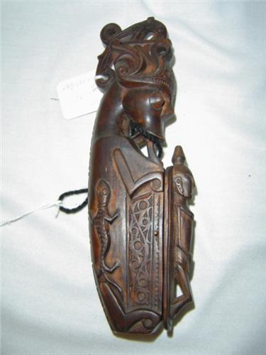 Small 7.75" wall hanging Gold Carrier, excellant shape. Often a female member of the Batak clan was entrusted with the family wealth. Gold and other objects of value were placed in the carrier and then the carrier itself was secreted awary. Ornately carved from plantation grown hardwoods, the body of the carrier depicts Singa, a mythical lion and is adorned with an additional guardian figure. Carefully remove the wooden pin to reveal the hidden compartment behind the figure. An occasional application of oil will help maintain the high luster of the wood. The Batak homeland is the island of Sumatra at the western end of the modern Republic of Indonesia. It's the fifth largest island in the world and many other tribes live there. Batak peoples live in the remote areas of the mountainous highlands and the eastern and western coastal regions. One thousand meters above sea level, the highlands steep valleys and thick forests made the Batak region inaccessible and impenetrable during the period of scientific, missionary and colonial development. Long known to Europe, the Batak have only relatively recently come to the attention of the West. The Batak consist of six ethenic groups, diverse in dialect and historical experience. Although Islam and Christianity have been strong influences, many of the Batak population still follow religious ideas and practices of their ancestors. The Batak are one of the few cannibalistic peoples know to have a sophistacated calendar, written language, and with their gold trade, also a system of numbers. The carvers of the Batak peoples are considered some of the best primitive carvers in the world. The quality of their workmanship and the beauty of their peices bear witness to the talent of the people that produce them.