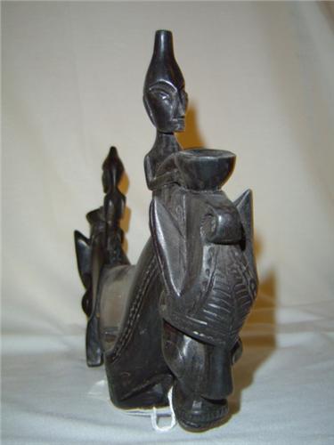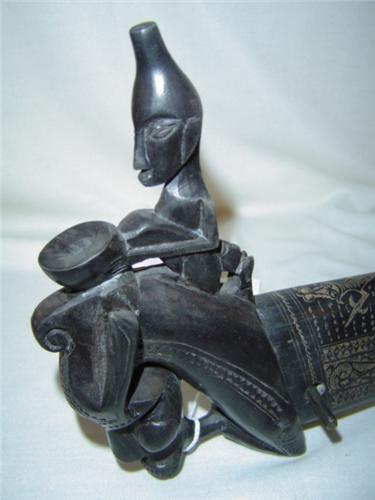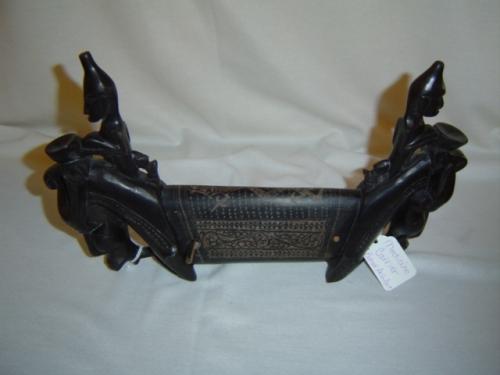 All knowing, in magic, medicine, and religion, the Datu (priest) of a Batak Village is the most influential of a community. These potion carriers are part of the Datu's (and other healers) traditional paraphernalia. Some potion carriers are also used in protective roles for households. Medicinal herbs and potions with special powers are stored in these containers.The center piece is made of bone (Water Buffalo or Mountain Goat) and fitted with wood carvings on both ends. The horn is hand inscribed and this potion carrier features a lizard depicting the guardian god "Boraspati" along the upper ridge. The ends are sealed with two large wooden stoppers caved from Kaya Laut (Sea Wood), a holy wood of the Batak people. The ornate stoppers feature the traditional squatting figure astride the back of "Singa", a mythical lion. This piece, 11" long by 7" high and approx. 2" wide, is a transitional carving featuring aspects of both the old and new generation carvers. (excellant condition) The Batak homeland is the island of Sumatra at the western end of the modern Republic of Indonesia. It's the fifth largest island in the world and many other tribes live there. Batak peoples live in the remote areas of the mountainous highlands and the eastern and western coastal regions. One thousand meters above sea level, the highlands steep valleys and thick forests made the Batak region inaccessible and impenetrable during the period of scientific, missionary and colonial development. Long known to Europe, the Batak have only relatively recently come to the attention of the West. The Batak consist of six ethenic groups, diverse in dialect and historical experience. Although Islam and Christianity have been strong influences, many of the Batak population still follow religious ideas and practices of their ancestors. The Batak are one of the few cannibalistic peoples know to have a sophistacated calendar, written language, and with their gold trade, also a system of numbers. The carvers of the Batak peoples are considered some of the best primitive carvers in the world. The quality of their workmanship and the beauty of their peices bear witness to the talent of the people that produce them.