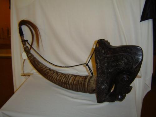 All knowing, in magic, medicine, and religion, the Datu (priest) of a Batak Village is the most influential of a community. This rare and endangered potion carrier is part of the Datu's traditional paraphernalia. Medicinal herbs and potions with special powers are stored in these containers. The potion carrier is made from the full horn of an old water buffalo with two traditional squatting figures carved into the tip and adorned with a tuft of horse hair. The open end is sealed with a large wooden stopper caved from Kayu Laut (Sea Wood), a holy wood of the Batak people. The front ornate stopper features an ornately carved head of "Singa", a mythical lion. This piece, 27.5" long by 12" high and approx. 3.2" wide, is rare, unusual and in excellant condition. The Batak homeland is the island of Sumatra at the western end of the modern Republic of Indonesia. It's the fifth largest island in the world and many other tribes live there. Batak peoples live in the remote areas of the mountainous highlands and the eastern and western coastal regions. One thousand meters above sea level, the highlands steep valleys and thick forests made the Batak region inaccessible and impenetrable during the period of scientific, missionary and colonial development. Long known to Europe, the Batak have only relatively recently come to the attention of the West. The Batak consist of six ethenic groups, diverse in dialect and historical experience. Although Islam and Christianity have been strong influences, many of the Batak population still follow religious ideas and practices of their ancestors. The Batak are one of the few cannibalistic peoples know to have a sophistacated calendar, written language, and with their gold trade, also a system of numbers. The carvers of the Batak peoples are considered some of the best primitive carvers in the world. The quality of their workmanship and the beauty of their peices bear witness to the talent of the people that produce them.
