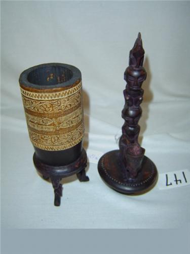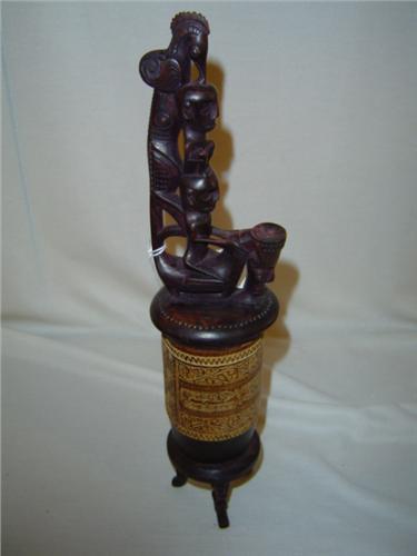 All knowing, in magic, medicine, and religion, the Datu (priest) of a Batak Village is the most influential of a community. These potion carriers are part of the Datu's (and other healers) traditional paraphernalia. Some potion carriers are also used in protective roles for households. Medicinal herbs and potions with special powers are stored in these containers.This ornate potion carrier stands on three carved traditional squatting figures, carved in an older traditional Batak style. The center piece is made of bamboo seated in a wood base. The Batak Ritual Calendar is hand inscribed down the front and a Batak Compass along the back side. The top is sealed with a ornate wooden stopper caved from Seawood, a holy wood of the Batak people. The stopper features a bird and traditional squatting figure supported by a Datu astride the back of "Singa", a mythical lion. A carved lizard, depicting the guardian god "Boraspati", climbs the back of the stopper. This piece, approx. 12.5" tall with a center diameter of 2.38" (top carved stopper 2.75" wide by 3" deep), is in excellant condition. The Batak homeland is the island of Sumatra at the western end of the modern Republic of Indonesia. It's the fifth largest island in the world and many other tribes live there. Batak peoples live in the remote areas of the mountainous highlands and the eastern and western coastal regions. One thousand meters above sea level, the highlands steep valleys and thick forests made the Batak region inaccessible and impenetrable during the period of scientific, missionary and colonial development. Long known to Europe, the Batak have only relatively recently come to the attention of the West. The Batak consist of six ethenic groups, diverse in dialect and historical experience. Although Islam and Christianity have been strong influences, many of the Batak population still follow religious ideas and practices of their ancestors. The Batak are one of the few cannibalistic peoples know to have a sophistacated calendar, written language, and with their gold trade, also a system of numbers. The carvers of the Batak peoples are considered some of the best primitive carvers in the world. The quality of their workmanship and the beauty of their peices bear witness to the talent of the people that produce them.