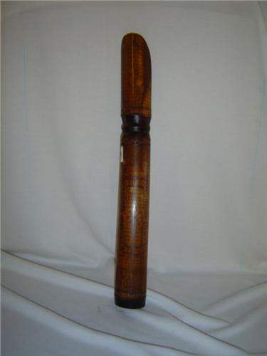 This 18.75" Traditional Bamboo Water Carrier is elaborately inscribed with the Ritual Batak Calendar, Batak Compass, writings and decorative work. The amazing inscription will take a carver several days to complete. Common in old bamboo, there's a couple age crack in this container but it remains an incredible work of art. The Batak homeland is the island of Sumatra at the western end of the modern Republic of Indonesia. It's the fifth largest island in the world and many other tribes live there. Batak peoples live in the remote areas of the mountainous highlands and the eastern and western coastal regions. One thousand meters above sea level, the highlands steep valleys and thick forests made the Batak region inaccessible and impenetrable during the period of scientific, missionary and colonial development. Long known to Europe, the Batak have only relatively recently come to the attention of the West. The Batak consist of six ethenic groups, diverse in dialect and historical experience. Although Islam and Christianity have been strong influences, many of the Batak population still follow religious ideas and practices of their ancestors. The Batak are one of the few cannibalistic peoples know to have a sophistacated calendar, written language, and with their gold trade, also a system of numbers. The carvers of the Batak peoples are considered some of the best primitive carvers in the world. The quality of their workmanship and the beauty of their peices bear witness to the talent of the people that produce them.