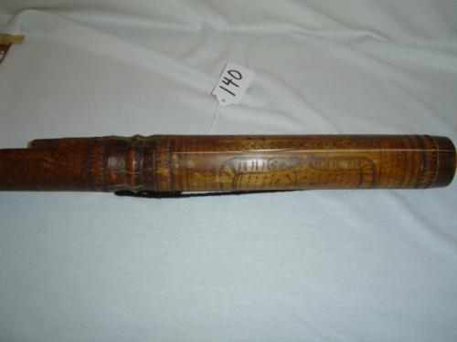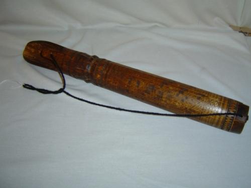 This 17" Traditional Bamboo Water Carrier is elaborately inscribed with the Ritual Batak Calendar, Batak Compass, writings and decorative work. The amazing inscription will take a carver several days to complete. Common in old bamboo, there's a couple age crack in this container but it remains an incredible work of art. The Batak homeland is the island of Sumatra at the western end of the modern Republic of Indonesia. It's the fifth largest island in the world and many other tribes live there. Batak peoples live in the remote areas of the mountainous highlands and the eastern and western coastal regions. One thousand meters above sea level, the highlands steep valleys and thick forests made the Batak region inaccessible and impenetrable during the period of scientific, missionary and colonial development. Long known to Europe, the Batak have only relatively recently come to the attention of the West. The Batak consist of six ethenic groups, diverse in dialect and historical experience. Although Islam and Christianity have been strong influences, many of the Batak population still follow religious ideas and practices of their ancestors. The Batak are one of the few cannibalistic peoples know to have a sophistacated calendar, written language, and with their gold trade, also a system of numbers. The carvers of the Batak peoples are considered some of the best primitive carvers in the world. The quality of their workmanship and the beauty of their peices bear witness to the talent of the people that produce them.