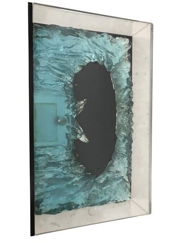 Wall mountable Batarang shadowbox (batarang not included). Clear casting resin with tint and foil. Made by a former Icons employee. Some scratches on the bottom of the case. 1 small scratch on the front towards the top (14"x 9" x 3")