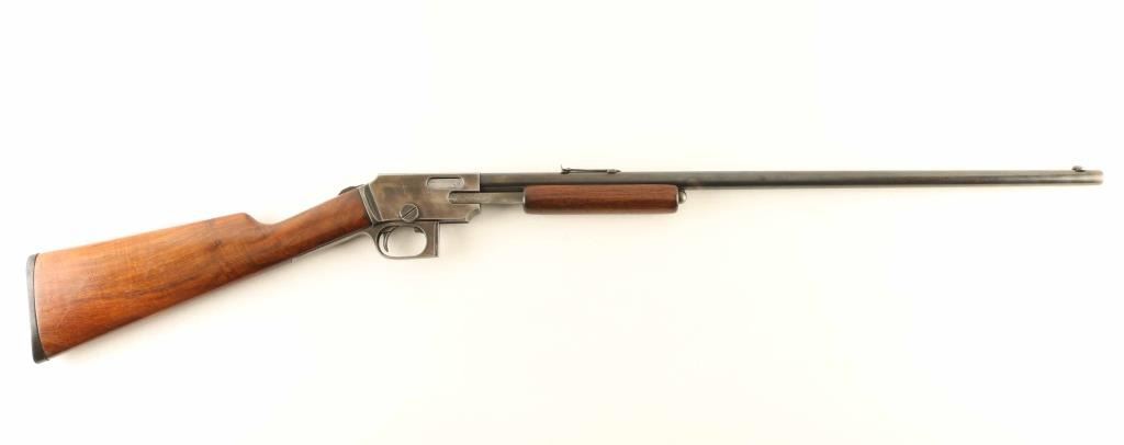 Rifle. Semi-Automatic. Rare Baker Gun & Forging co. Batavia (New York) Automatic Rifle Model No. 1 in .22 Short.24" round barrel with open iron sights. Smooth walnut stock, and forearm. Thumb safety on the tang. Almost a exact copy of Savages 1903,1909. All markings are clear. Bore appears rough/dark, Blued finish is about 70%, with most loss on the receiver/triggerguard. There is some slight pitting around the edges of same. Action is crisp/tight. Missing the 7-rd magazine. Note* Savage sued for patent infringement ending this rifles short life. NRA Condition-Good. C&R Firearm.
