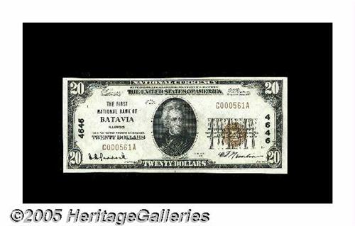<B>Batavia, IL</B></I> - $20 1929 Ty. 1 <B>The First NB</B></I> Ch. # 4646<BR>This <B>Choice Crisp Uncirculated</B></I> example retains full original crispness and paper body. With a bit more generous top margin we'd consider this to be an unquestionable Gem. Batavia was once known as "The Windmill City" and was at one time the largest windmill manufacturing center in the world. Presidential widow Mary Todd Lincoln was treated here at the Bellevue Place Sanitarium in 1875. We expect this Kane County piece to bring at least...