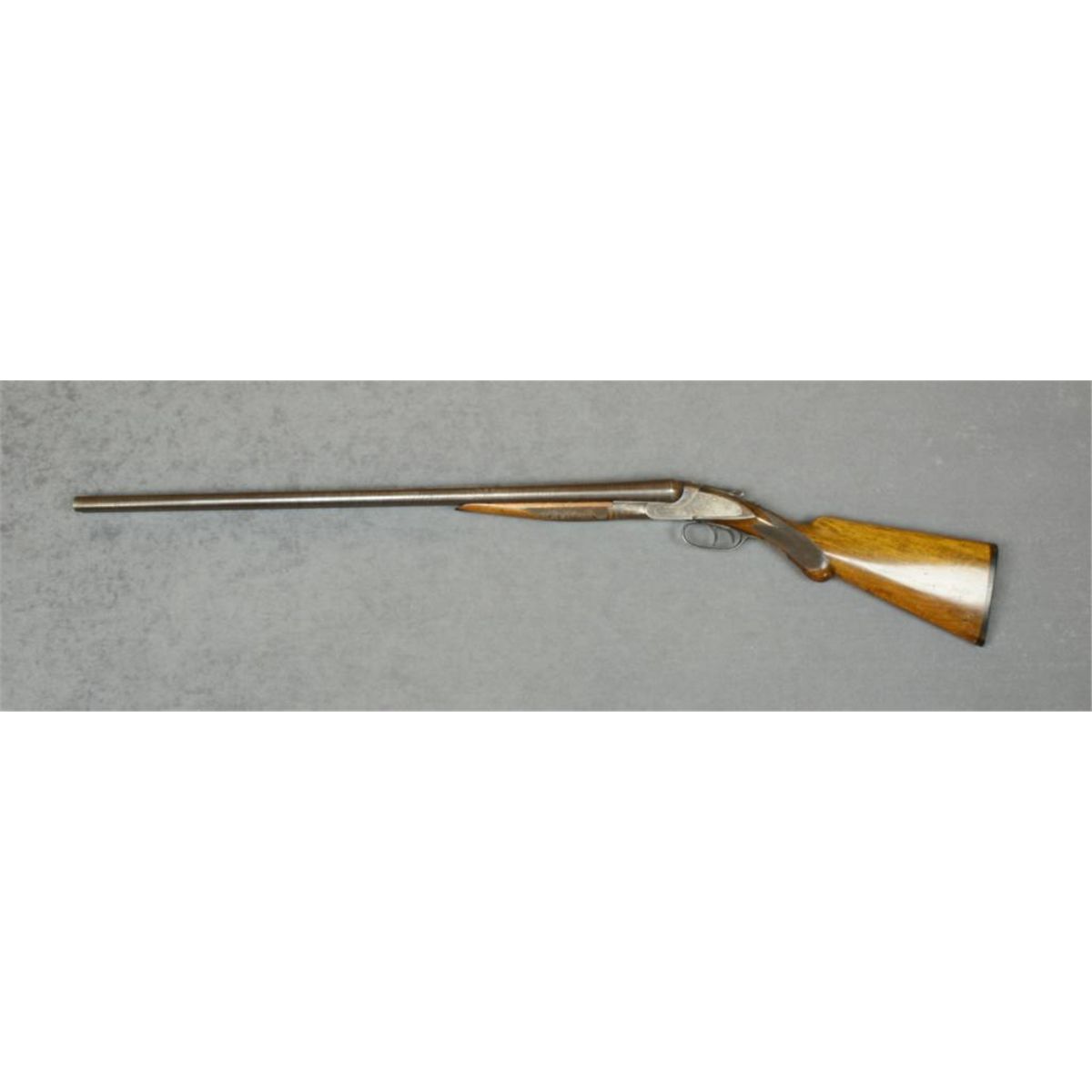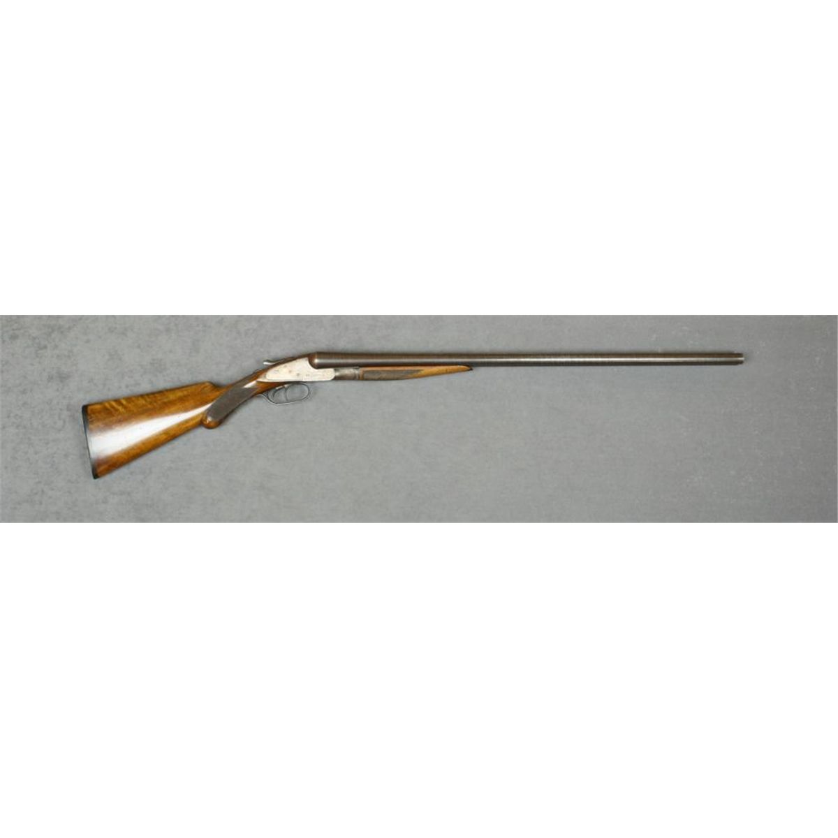 Batavia Leader SxS concealed hammer shotgun, 12 gauge, 30” barrels, case hardened receiver, checkered wood stocks, #89168. This gun is in overall good condition showing a grey Damascus-design on barrels, strongtraces of case colors on receiver, very good wood stocks with hard rubber butt pad; bores are overall good with a dent half way down the barrel of the left side. Est.: $250-$450.