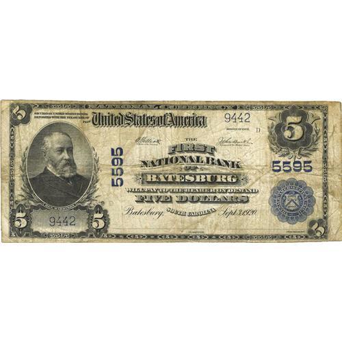 <B>Batesburg, SC</B></I> - $5 1902 Plain Back Fr. 607 <B>The First NB</B></I> Ch. # 5595<BR>This rare Lexington County bank is not too common and public offerings of any example are few and far between. <B>Fine,</B></I> problem-free save for a bit of light soiling visible.