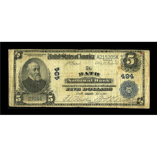 <B>Bath, ME</B></I> - $5 1902 Plain Back Fr. 598 <B>The Bath NB</B></I> Ch. # 494<BR>Printed signatures of F.D. Hill and Wm. D. Sewall grace this $5. <B>Fine.</B></I><BR><BR><b>Shipping:</b> Coins & Currency (<a target="_blank" href="http://www.heritageauctions.com/common/shipping.php">view shipping information</a>)