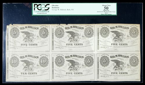 Bath, NY - George W. Hallock Uncut Remainder Sheet of Six. 5-10¢ 1862. PCGS About New 50 Apparent. A patriotic eagle vignette is seen at the center on both denominations of notes. Minor edge damage resulted in the Apparent grade.