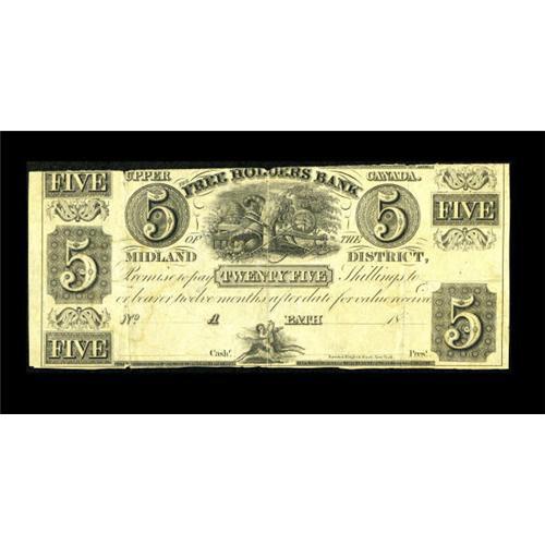 <B>Bath, UC- The Free Holders' Bank of the Midland District</B></I> $5 18__ Ch. # 310-10-04R<BR> This joint stock banking company was organized shortly before the financial panic of 1837. Less than a month after starting up, the Legislature of Upper Canada passed a law prohibiting the formation of any further banks of this type. Unfortunately for this institution, it was not grandfathered from the effects of this legislation, and, before it could actually open for business, the firm was forced to wind up its affairs. All of the notes known from here are remainders, which come in only two denominations, with both being quite scarce. <B>Fine-Very Fine,</B></I> trimmed in just a bit at the top with a tiny nick at the center. <BR><I>From The Thomas M. Flynn Collection</B></I><BR><BR><b>Shipping:</b> Coins & Currency (<a target="_blank" href="http://www.heritageauctions.com/common/shipping.php">view shipping information</a>)