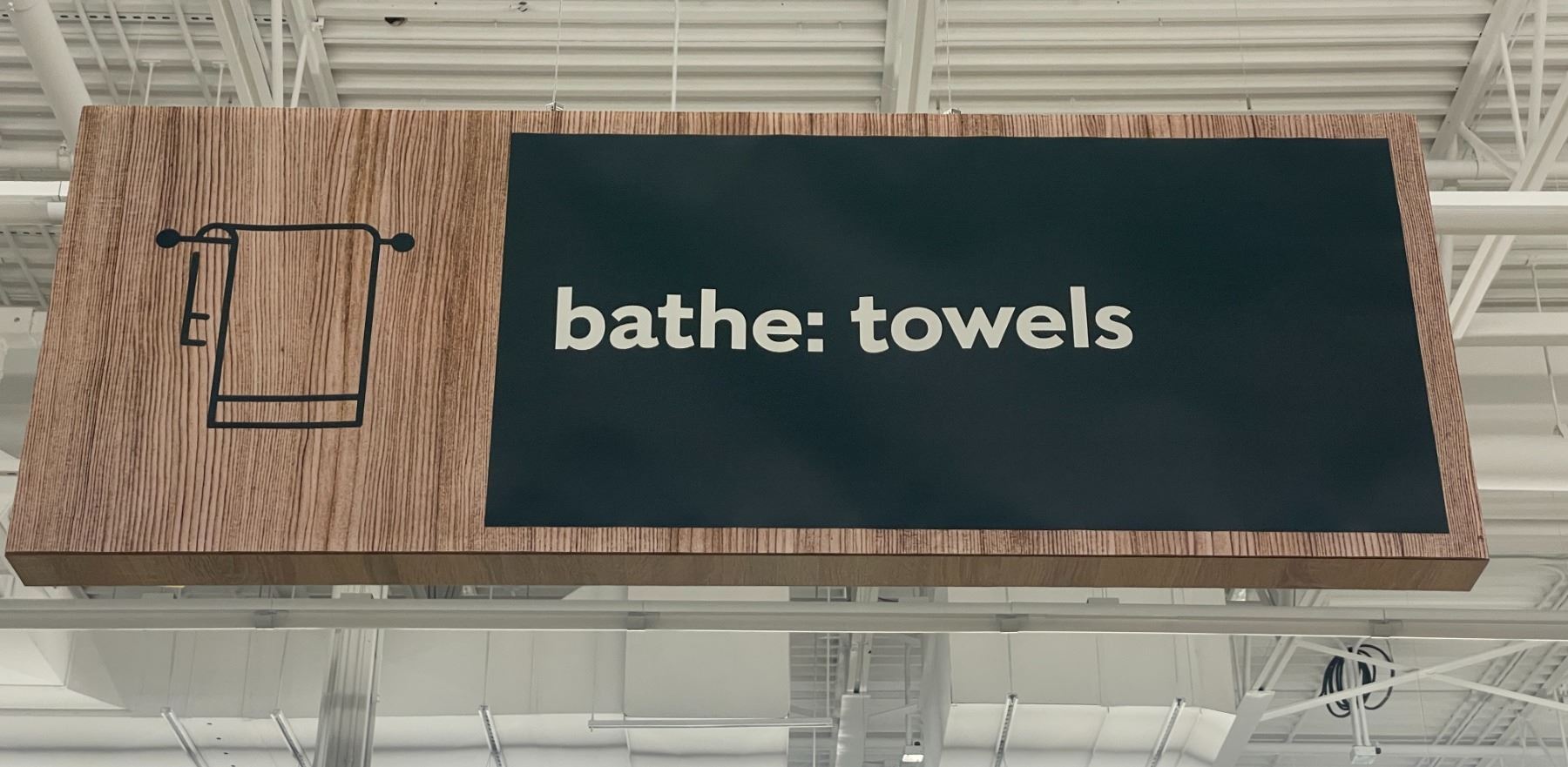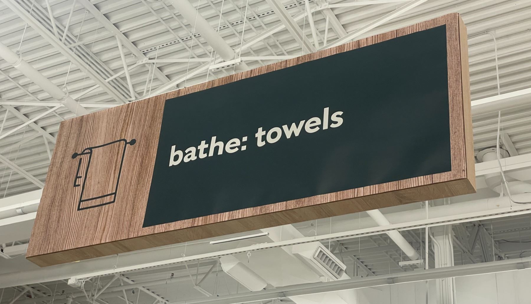 Bathe: towels store sign (approx. 52in W 19in H 3in D) BIDDERS ARE RESPONSIBLE FOR ALL COSTS ASSOCIATED WITH PICKUP OF THEIR LOTS INCLUDING BUT NOT LIMITED TO RENTAL OF EQUIPMENT, FORKLIFTS, LABOUR, TRUCKING, TOOLS ETC.