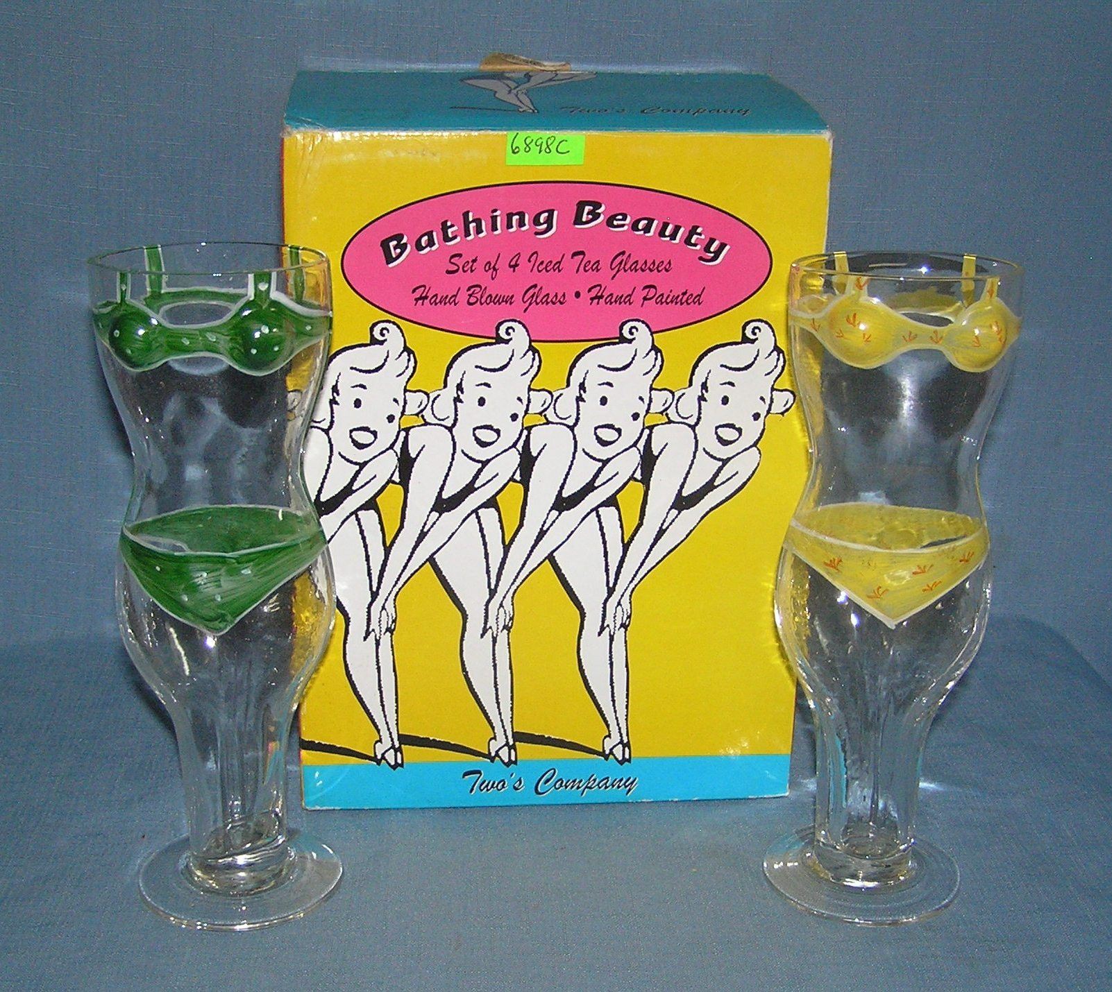 Bathing Beauties set of 4 iced tea girly glasses with skimpy bathing suits hand painted with original box est. value $50.00-$60.00
