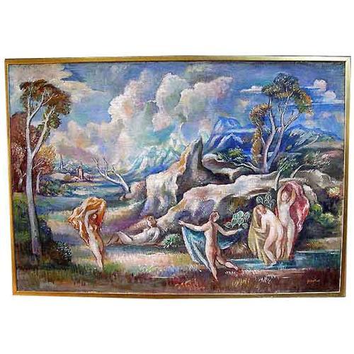 Bathing Nymphs signed ?Harriton? (lower right) oil on canvas (laid out on board) Large impressionist ?Bathing Nymphs? female nudes landscape painting, with a paper label title on the verso. Abraham Harriton is a listed artist who uses bright iridescent tones to purvey the happy mood of nudes gaily bathing and dancing in and around a pond in the midst of a surrealist landscape with blowing trees, clouds, and mountains. Size: 35 x 50 inches (painting), 39in. x 54in. (frame).
