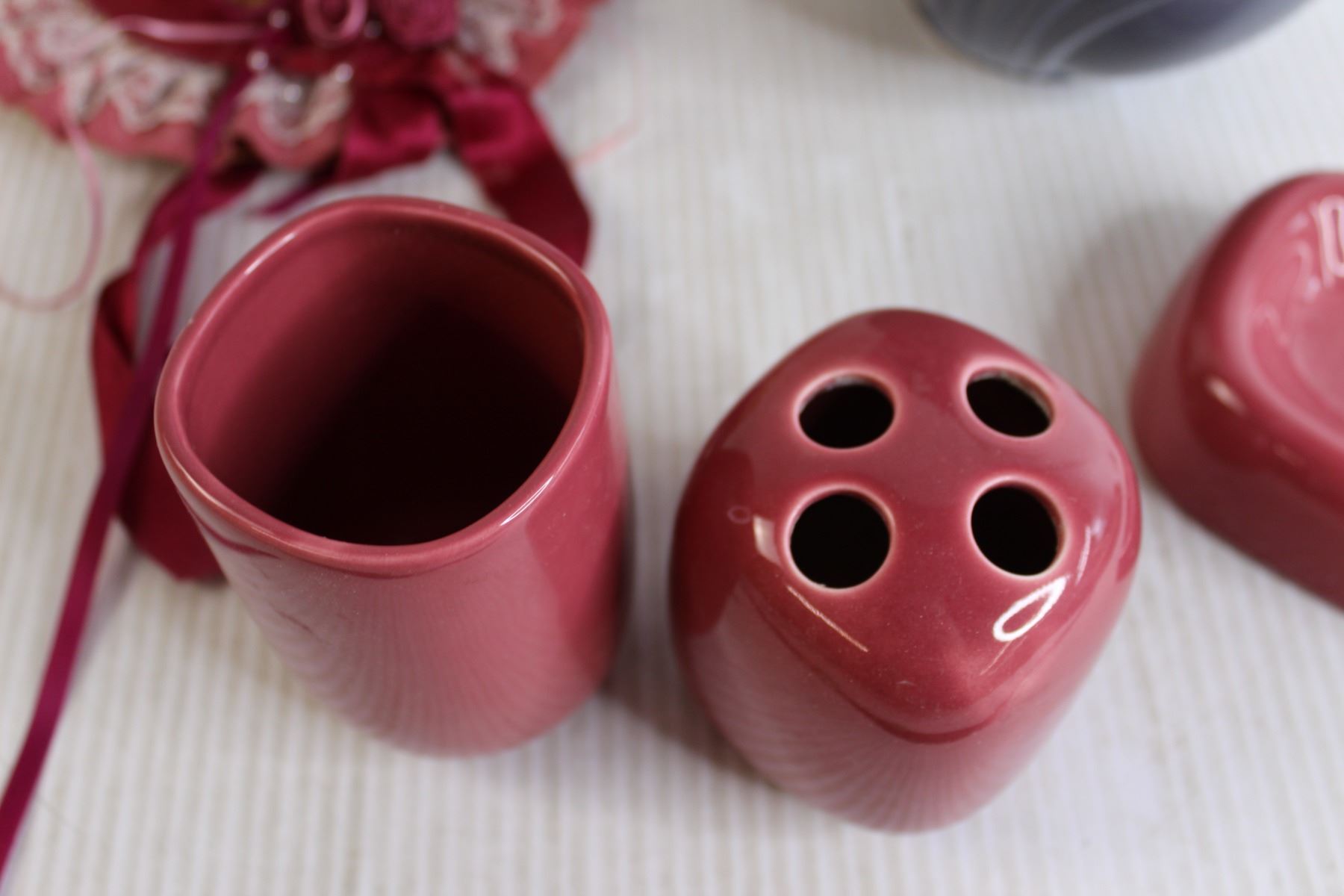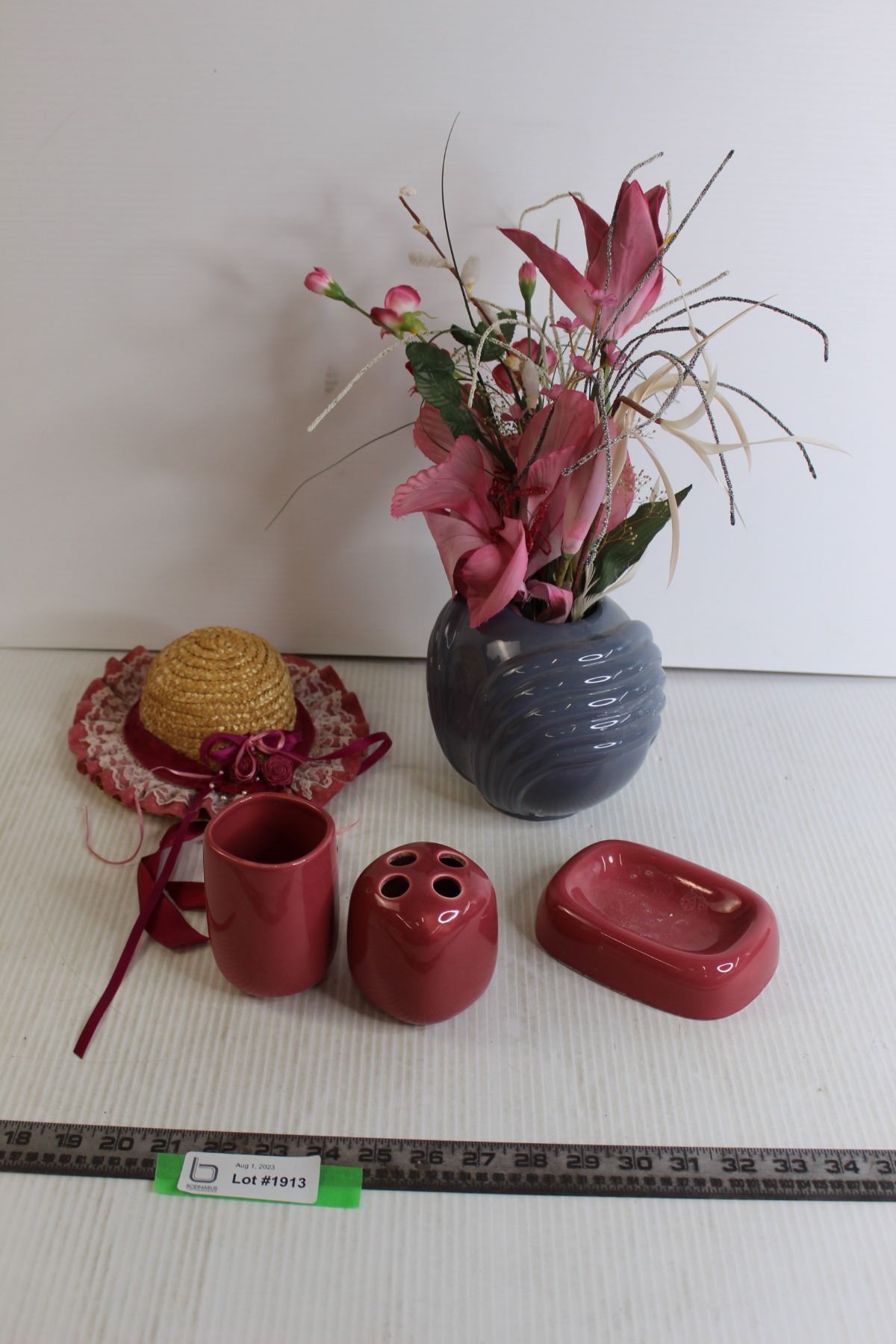 Bathroom Decorations (Toothbrush Holder with Cup, Fake Flowers in Vase, Wicker Hat)
