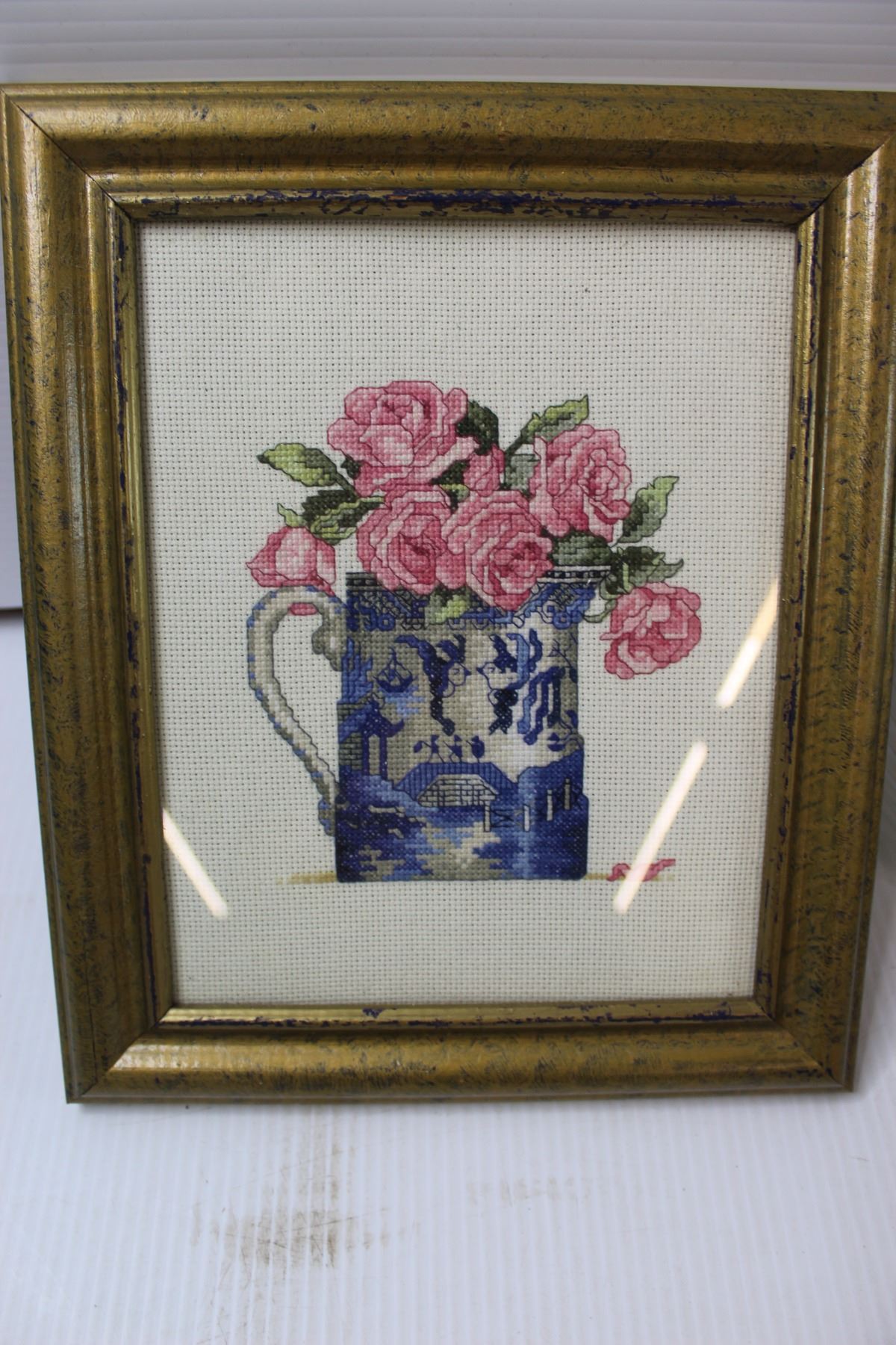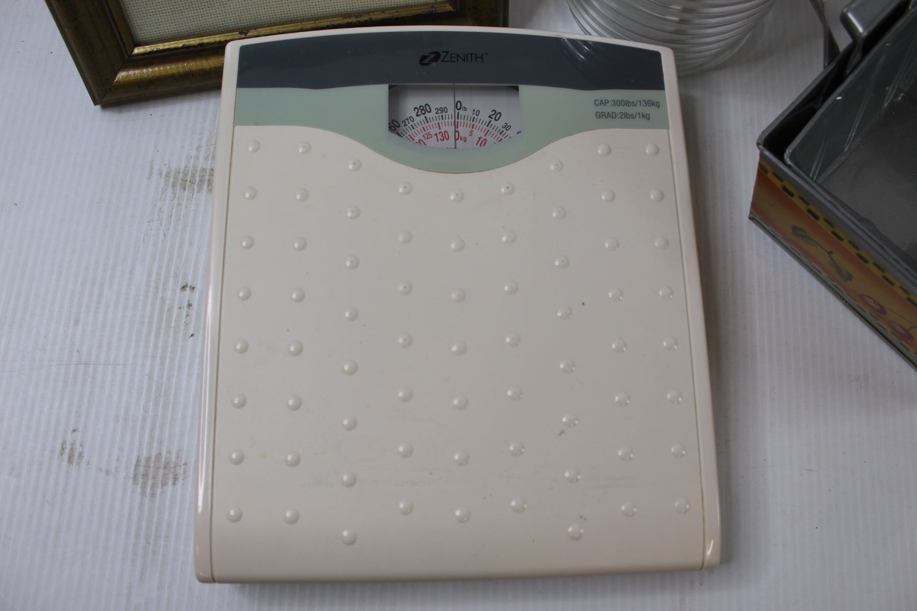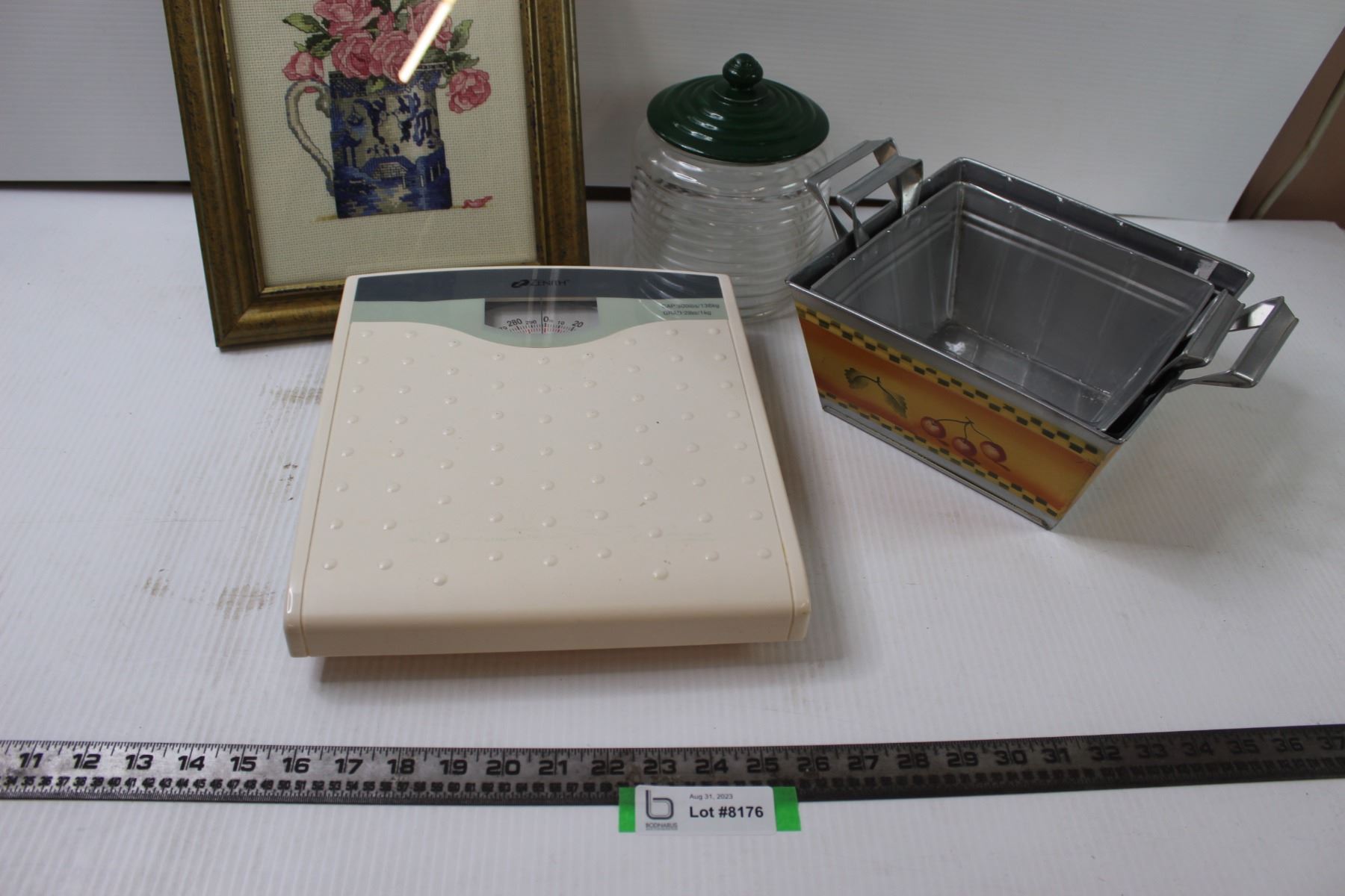 Bathroom Scale, Old Cookie Jar, Needlepoint and Two Planters