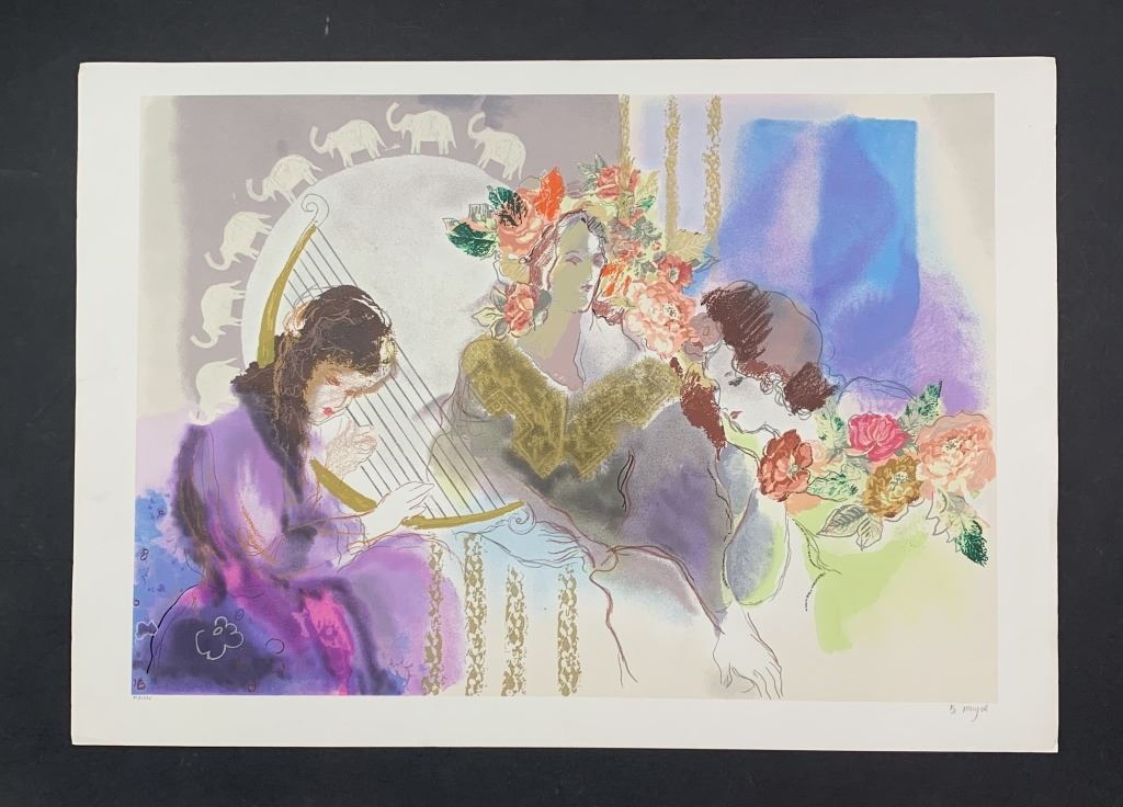 Batia Magal's "Musical Interlude" limited edition print signed and numbered XLI/CXXV. This piece is of three women, with one of them playing the harp in the foreground. This piece is in very good condition with minor soiling at left, very small minor crease upper right corner, miniscule (hardly noticeable) minor creases upper right and lower right corners.