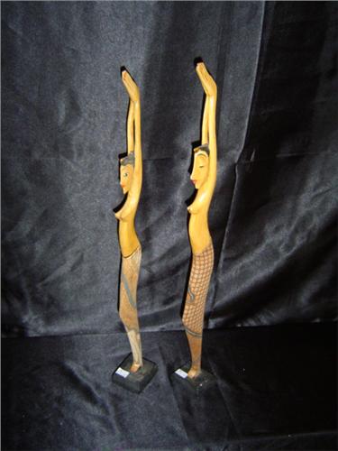 Hand-carved, painted, and batiked, set of 2. 20.25"H, 2.25"W, 2"D