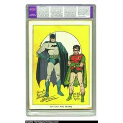 Batman #1 (DC, 1940) CGC Apparent VF+ 8.5 Moderate (P) Off-white to white pages. This is easily one of the most recognizable and classic of all covers drawn by Batman creator Bob Kane. Inside, there is a text article with a photo of Kane, and a reprint of Batman's origin, as well as an awesome pin-up on the back cover by him that beckons readers to "Cut out and frame." Fortunately, the original owner of this copy declined the tempting invitation to snip this first back cover poster of the Boy Wonder and Caped Crusader. This issue contains a plethora of other firsts that were all originally intended to be published in Detective Comics, including: the first appearance of Batman's most famous enemy - the Joker; the first villainess in comics, the Cat (Catwoman, really); and the first mention of Manhattan as the Dynamic Duo's city of residence. As far as this example goes, it is splendid even with the restoration. It has incredible eye-appeal and bright hues. CGC notes, "Restoration includes: color touch, pieces added, tear seals, reinforced." Overstreet 2003 GD 2.0 value = $6,767; VG 4.0 value = $13,534; FN 6.0 value = $20,300; VF 8.0 value = $49,060. Important notice: Heritage usually auctions material at the rate of 200-250 lots per hour. On some occasions eBay Live bid software or the Internet may not be able to keep up with the pace of the auction. We recommend placing a realistic absentee bid now as insurance to avoid disappointment. Occasionally the auctioneer may eliminate or reject an eBay Live bid, and the auctioneer may also reopen a lot after the close of the eBay live bidding (usually because we missed an audience bid), and may reject your bid even if it shows you as the winning bidder. By bidding via eBay Live, you agree that Heritage may award the lot to another bidder at its sole discretion under the circumstances described above or any other reasonable circumstances. Also please note that all Heritage lots purchased through eBay Live carry a 20% Buyer's Premium. Please make sure you read the Terms and Conditions before you bid.
