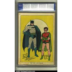 Batman #1 (DC, 1940) CGC VF 8.0 Cream to off-white pages. One of the most important and influential comics of all time, this landmark book currently ranks as number six (with a bullet) on Overstreet's listing of the Top Golden Age Comics. An almost overnight sensation, Batman exploded into the public consciousness in 1939 with the publication of Detective #27. Scarcely a year later, he and his youthful ward, Robin the Boy Wonder, were awarded their own book, joining Superman as one of DC's headliners. The front cover, with a grinning Batman and Robin swinging over the rooftops of a sleeping city, is an image familiar to millions having become an almost iconic image. The most recent CGC census information available to us has only two other copies of this issue graded higher (and not by much). Unrestored key books like this are becoming rare and rare in the marketplace, making this a treasure on so many levels. This copy must be seen to be believed and appreciated, so treat yourself with a long look at the first issue of an American classic going strong over 600 issues and 60 years later. Overstreet 2002 VF 8.0 value = $45,150. Important notice: We expect to be auctioning lots at the rate of 200-250 per hour. Sometimes eBay Premier live bid software cannot keep up with that pace, so we strongly recommend that you place a realistic proxy bid now as insurance to avoid disappointment. Also please note that all Heritage/CAA lots purchased through eBay Premier carry a 20% Buyer's Premium.