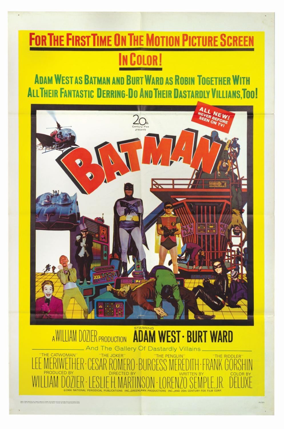 (TCF, 1966) An original U.S. 1-sheet poster for Batman, the first feature length film based on the iconic superhero. Starring Adam West and Burt Ward as Batman and Robin, the film's cast of characters are proudly depicted on this classic poster. Folded as issued, the poster measures 41"x27" and is in very good condition with an extra horizontal fold in the upper third, minor smudging in the blank margins, some faint scuffing in the background of the image, a tiny chip to the upper right edge, and a small separation at the bottom fold juncture.