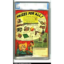 Batman #10 (DC, 1942). An inventive "artist" cover by Jerry Robinson highlights this classic early issue of Batman, which features artwork by Bob Kane, Jerry Robinson, George Roussos, and Henry Boltinoff. This issue also contains an early Catwoman story, wearing a new costume since her earlier appearance in Batman #3. This classic cover still boasts exceptional color and clarity, making this a fabulous book for any Batman collector. CGC notes, "Moderate tanning of interior front and back covers." CGC VF- 7.5 Cream to off-white pages. Overstreet 2001 FN 6.0 value = $971; NM 9.4 value = $3,400. Important notice: We expect to be auctioning lots at the rate of 200-250 per hour. Sometimes eBay Premier live bid software cannot keep up with that pace, so we strongly recommend that you place a realistic proxy bid now as insurance to avoid disappointment. Also please note that all Heritage/CAA lots purchased through eBay Premier carry a 20% Buyer's Premium.
