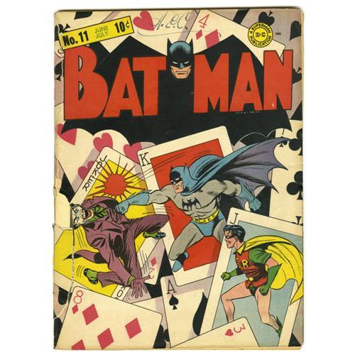 <B>Batman #11 (DC, 1942) Condition: FR.</B></I> Classic Joker "playing card" cover by Fred Ray and Jerry Robinson. The front cover of this copy is detached; since the page quality is nice and the cover colors pretty fresh, this would be a good candidate for restoration work by a future owner. Overstreet 2006 GD 2.0 value = $697. <I>From the Collection of Harold Curtis.</B></I>